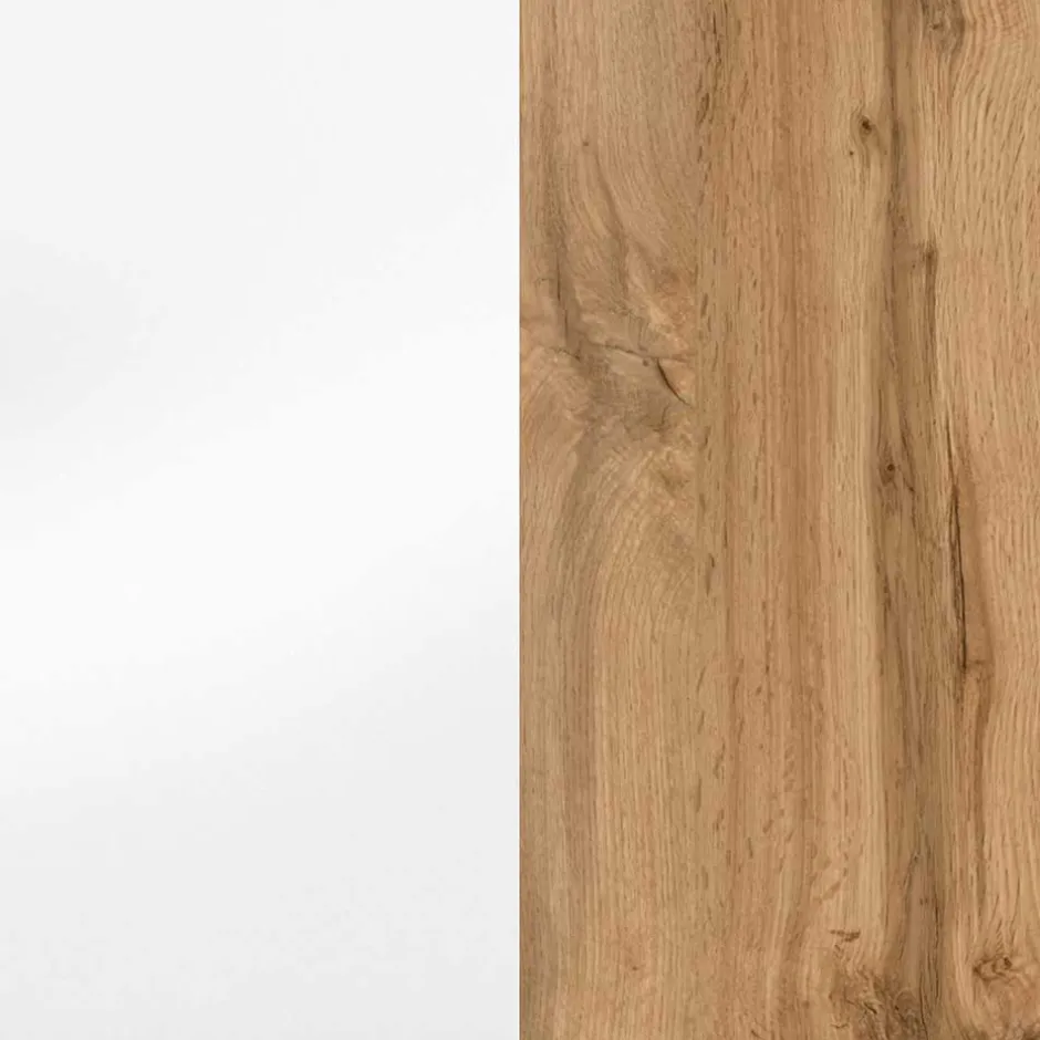 - Korpus sorgfältig melaminbeschichtet in Holzoptik Wildeiche, Front foliert in Weiß matt