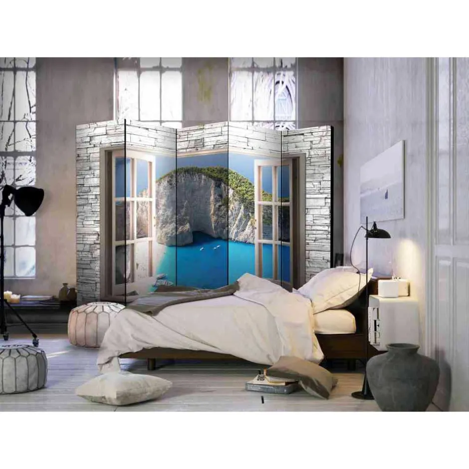 - Wunderbares Motiv mit geöffnetem Fenster und Blick auf eine Bucht in 3D-Optik