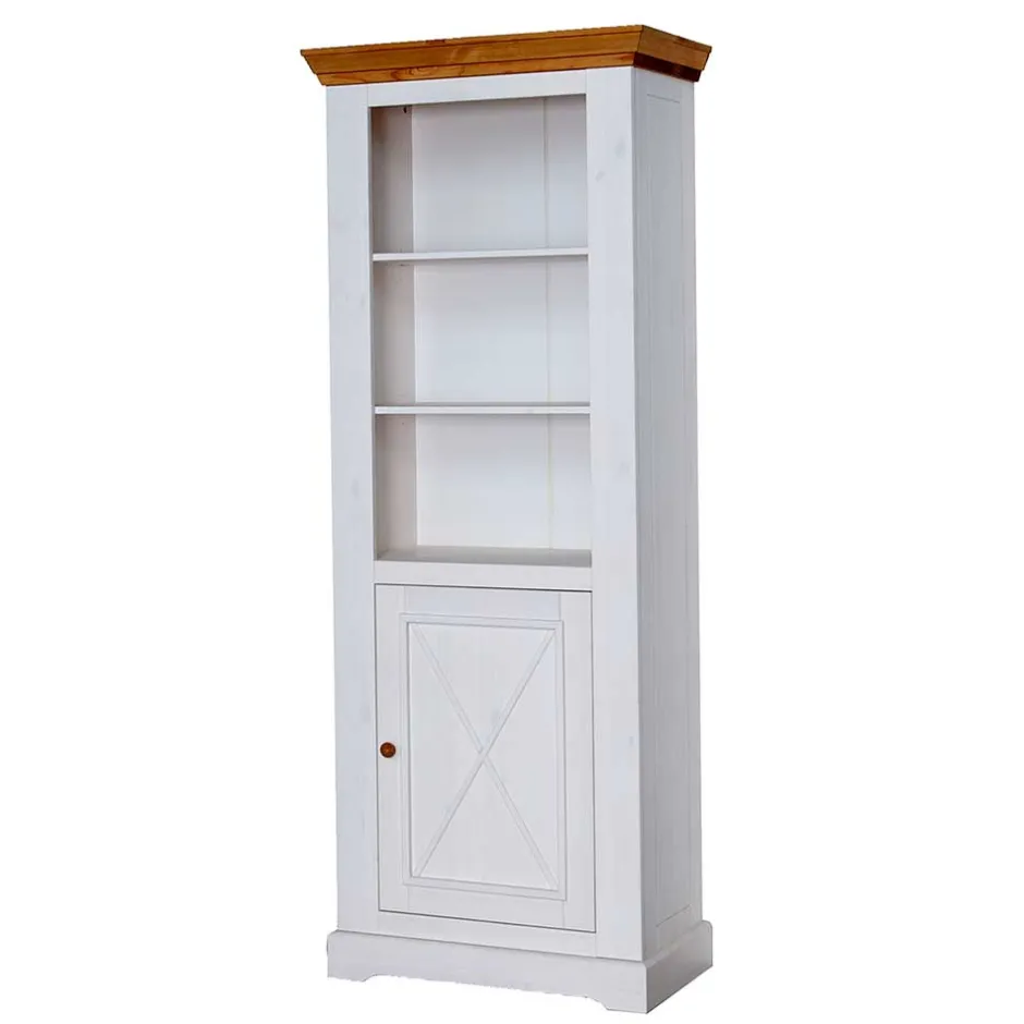 Das Regal zeichnet sich durch eine Tür aus, die mit dekorativ aufgesetzten Leisten versehen ist und so für eine zusätzliche optische Tiefe sorgt. Je nach räumlicher Anordnung und Vorliebe kann die Tür wahlweise rechts oder links montiert werden. Ein handlicher Holz-Knopfgriff verleiht dem Ganzen einen rustikalen Touch.