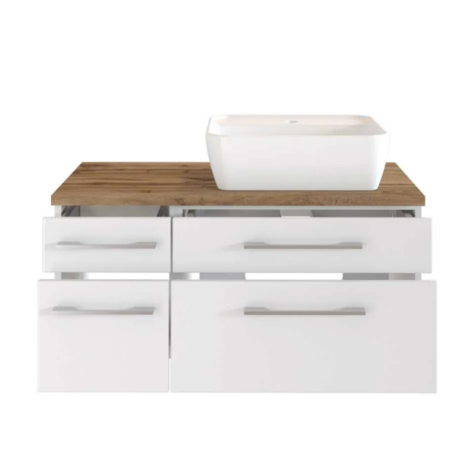 Mit einer komfortablen Breite von 90 cm bietet der Waschtisch reichlich Platz für Pflegeprodukte, Dekoration oder einfach eine aufgeräumte Optik. Vier Schubladen – die oberen mit ca. 11 cm und die unteren mit ca. 22 cm Innenhöhe – sorgen für cleveren Stauraum und lassen sich angenehm leicht rechtsseitig öffnen. Der integrierte Siphonausschnitt in der Deckplatte ist bereits vorbereitet, ebenso wie die vorgebohrten Löcher für die Armatur. Das hochwertige, weiße Keramik-Aufsatzbecken setzt einen stilvollen Akzent und überzeugt durch seine angenehme Tiefe und leicht zu reinigende Oberfläche.