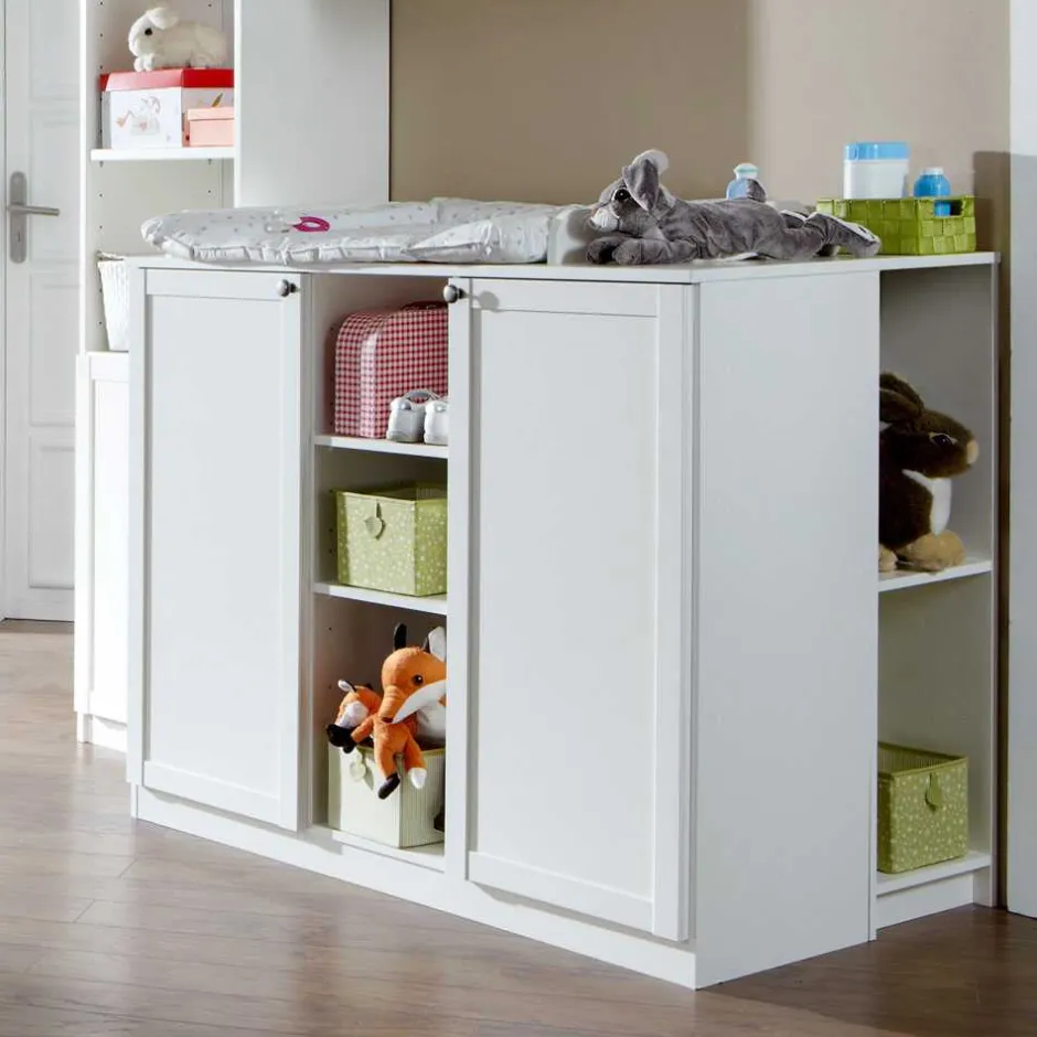 Mit einer Breite von 122 cm, einer Höhe von 93 cm und einer Tiefe von 75 cm bietet „Masculino“ nicht nur eine komfortable Wickelfläche, sondern auch reichlich Stauraum für Windeln, Kleidung, Pflegemittel und Spielsachen. Hinter zwei Türen mit langlebigen Metallbeschlägen verbirgt sich je ein Einlegeboden – ideal für geordnete Aufbewahrung. Drei offene Fächer an der Front und je zwei an den Seiten halten alles griffbereit, was im Alltag schnell zur Hand sein muss.