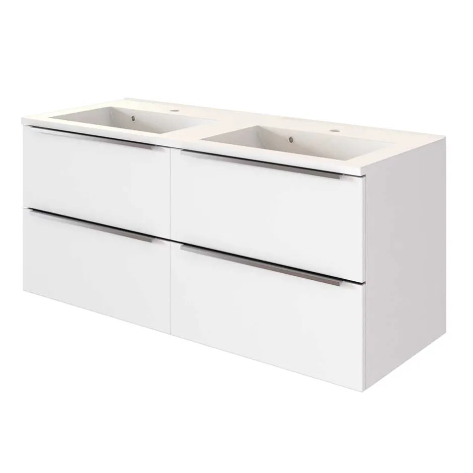 Mit einer Breite von 120 cm, einer Höhe von 56 cm und einer Tiefe von 47 cm bietet der Doppel-Waschtisch großzügigen Platz für all Ihre Pflegeprodukte. Vier geräumige Schubladen sorgen für eine optimale Organisation, sodass alles griffbereit und dennoch ordentlich verstaut ist. Dank des vorgefertigten Siphon-Ausschnitts in den oberen Schubladen bleibt der wertvolle Stauraum maximal erhalten – ein durchdachtes Detail für mehr Funktionalität.