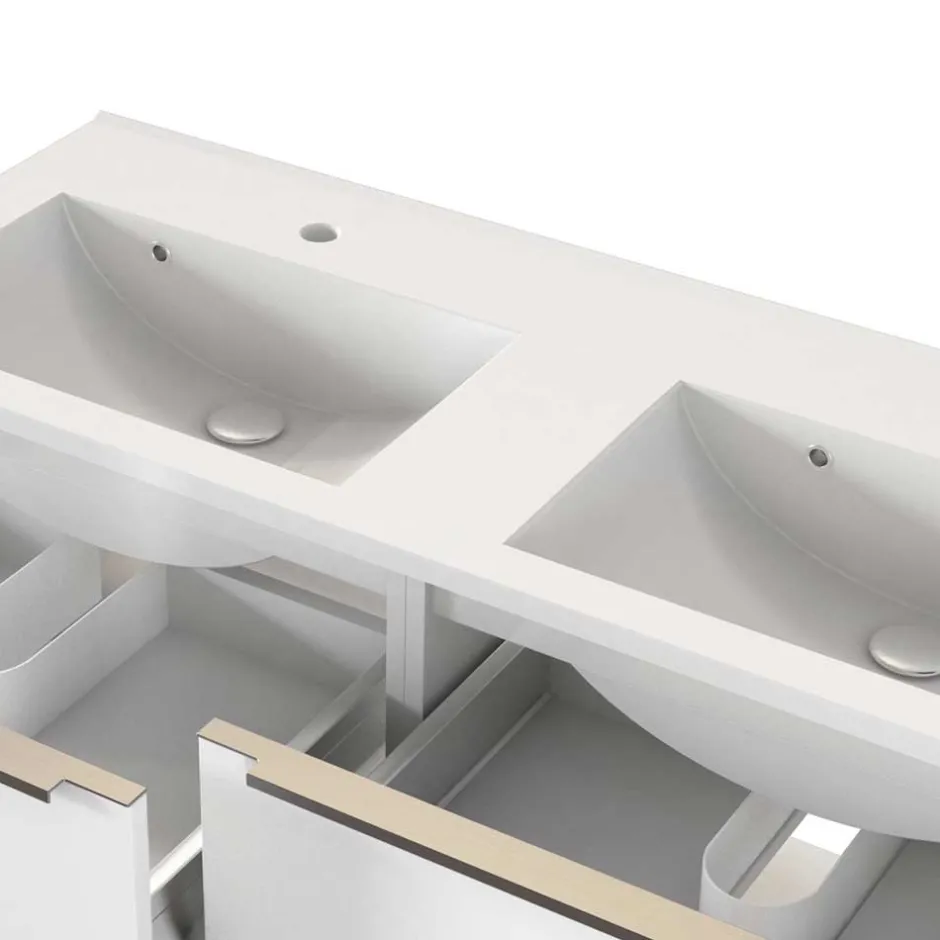 Zum Set gehört ein elegantes, hochwertiges Doppel-Waschbecken, das sich ideal für Familien oder Paare eignet. Bitte beachten Sie, dass Armaturen nicht im Lieferumfang enthalten sind – so können Sie Ihr Bad ganz nach Ihren persönlichen Vorlieben gestalten.