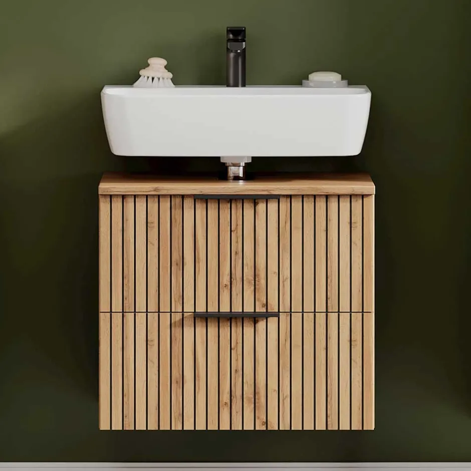 Gefertigt aus robuster Spanplatte, bietet dieser Waschbeckenunterschrank eine solide und langlebige Basis. Die pflegeleichte Oberfläche ist melaminbeschichtet in authentischer Holzoptik Wildeiche – eine Beschichtung, die nicht nur täuschend echt aussieht, sondern auch schützt: vor Feuchtigkeit, Kratzern und Alltagsbeanspruchung. Die Front überzeugt durch ihre spannende Rillenstruktur, die mit schwarzer Folie hinterlegt ist und dem Möbel Charakter und Tiefe verleiht. Ein echtes Highlight ist die Deckplatte mit einer Stärke von ca. 2,5 cm, die sich optisch wie haptisch massiv und wertig anfühlt.