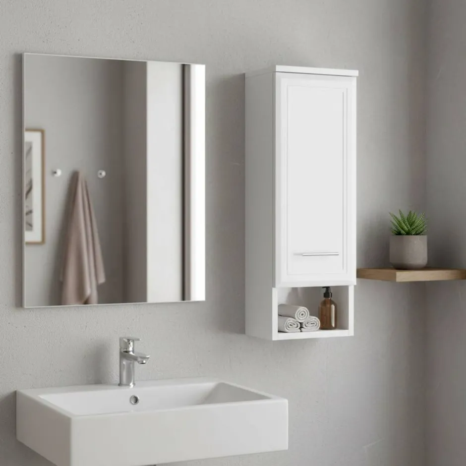 - Eine Tür, innen ein Einlegeboden (zwei Fächer)