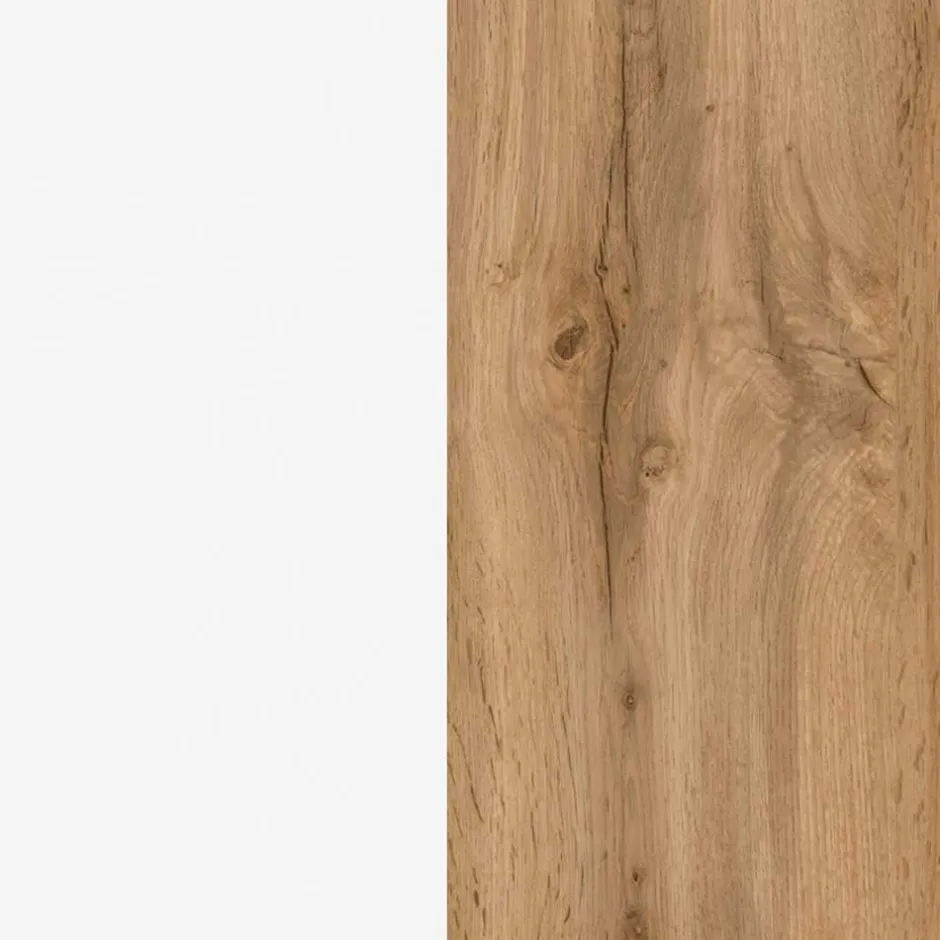 Die Wildeiche-Holzoptik des Korpus entsteht durch eine Melaminbeschichtung, ein Verfahren, bei dem eine strapazierfähige Dekorschicht unter Druck mit der Platte verbunden wird. Diese Technik macht die Oberfläche widerstandsfähig gegen Kratzer, Feuchtigkeit und Abnutzung und lässt sich mühelos reinigen. Die tiefgezogene Folierung in Mattweiß auf den MDF-Fronten wird fugenlos über die Kanten gezogen, was nicht nur für eine makellose Optik sorgt, sondern die Fronten auch vor dem Eindringen von Wasser schützt. Die weiße Rückwand vervollständigt das harmonische Farbspiel und zeugt von der Liebe zum Detail, die in jede Komponente dieses Möbelstücks eingeflossen ist.