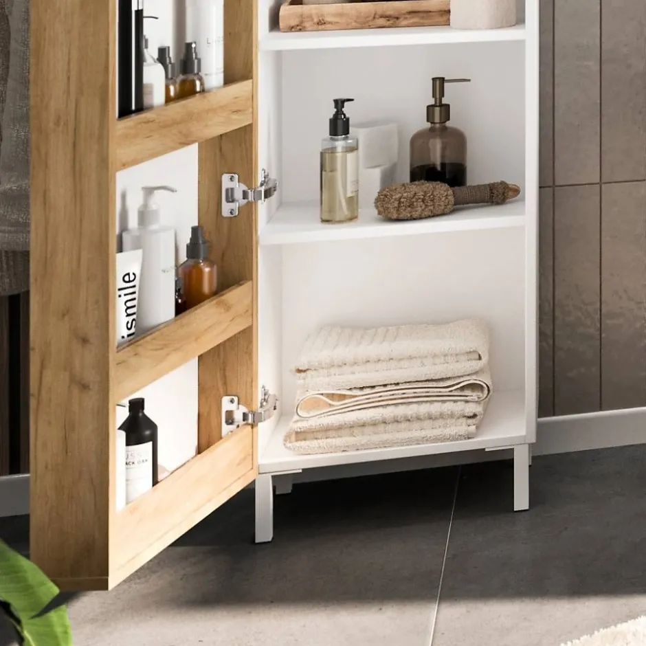 Ein Badezimmer soll nicht nur funktional sein, sondern auch eine harmonische Wohlfühlatmosphäre schaffen. Der Badezimmer Hochschrank „Nadals“ verbindet modernes Design mit praktischer Stauraumlösung. In klassischem Weiß und eleganter Eiche Holzoptik gehalten, fügt sich dieser Hochschrank nahtlos in verschiedene Einrichtungsstile ein und bringt eine natürliche Wärme in Ihr Badezimmer.