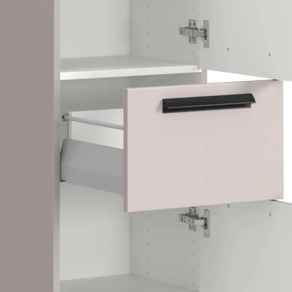 Die MDF-Oberfläche ist nicht nur pflegeleicht, sondern auch besonders widerstandsfähig gegenüber Feuchtigkeit. Gedämpfte Metallbeschläge sorgen für ein leises Schließen der Türen, während die stilvollen schwarzen Metallgriffe in Leistenform einen attraktiven Kontrast zum Hellgrau des Schranks bilden.