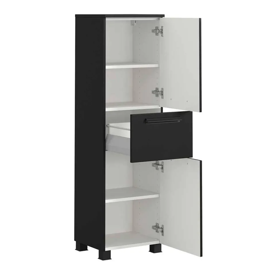 Setzen Sie in Ihrem Badezimmer stilvolle Akzente mit dem Midischrank „Ostoro“ in tiefem Schwarz. Die geradlinige Formsprache und die hochwertige Verarbeitung machen dieses Möbelstück zu einem echten Blickfang. Hergestellt in Deutschland, überzeugt der Schrank mit einer folierten MDF-Oberfläche, die außen in edlem Schwarz gehalten ist, während das Innere in strahlendem Weiß erstrahlt. Die tiefgezogenen Kanten sorgen für eine makellose Optik und zusätzliche Widerstandsfähigkeit.