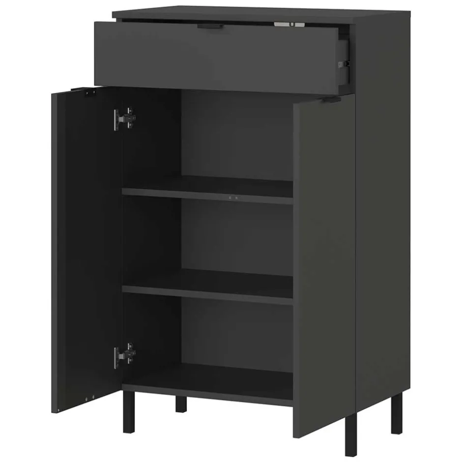 Das Vertiko bietet Ihnen eine Schublade mit Metallauszug sowie zwei Türen mit Einlegeböden, die für eine optimale Ordnung im Badezimmer sorgen. Zwei verstellbare Einlegeböden ermöglichen eine flexible Nutzung des Stauraums, während das stabile Vierfußgestell aus Metall und die schwarzen Kantengriffe das Gesamtbild harmonisch abrunden.