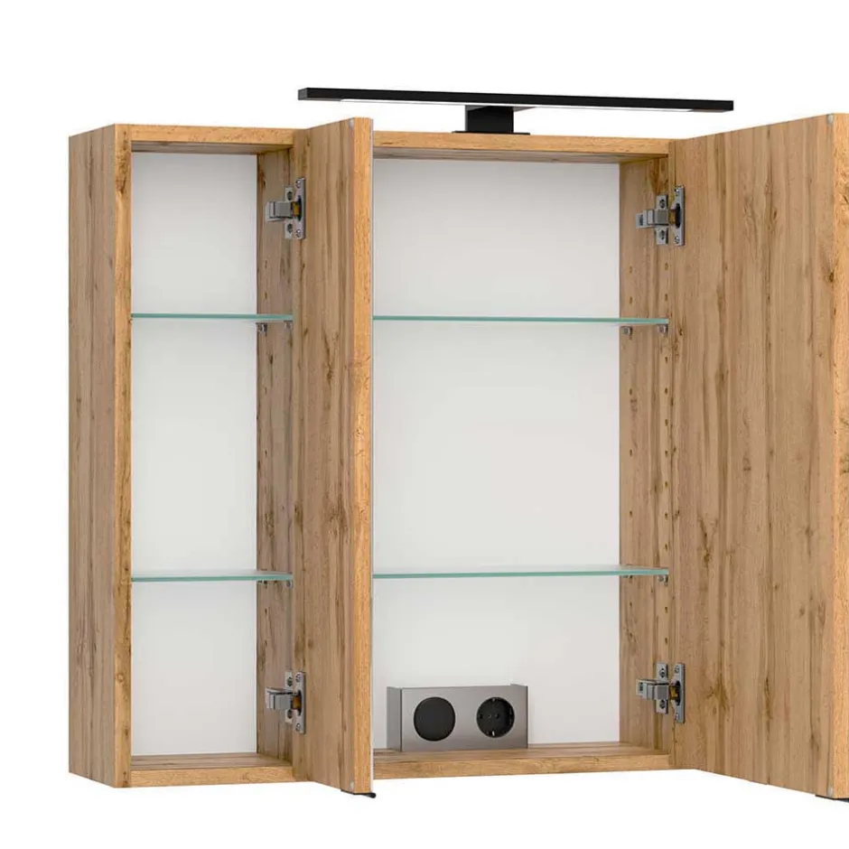 Der Spiegelschrank (BxHxT: 80x68x20 cm, Höhe ohne Leuchte: 64 cm) begeistert mit seiner großzügigen Spiegelfront, drei Türen, sechs edlen Glasböden und einer mittig integrierten Schalter-Steckdosenkombination. Die schwarze LED-Aufbauleuchte ist nicht nur ein Blickfang, sondern auch äußerst praktisch – sie lässt sich individuell vorne oder hinten positionieren. Energieeffizienzklasse G rundet das Gesamtpaket ab.
