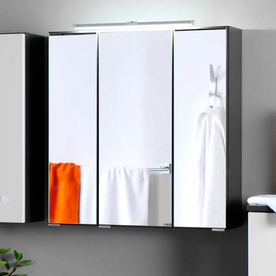 Der Spiegelschrank ist wahlweise 70 oder 80 cm breit, jeweils mit einer Höhe von 64 cm und einer Tiefe von 20 cm (ohne Aufbauleuchte). In der Variante mit LED-Aufbauleuchte beträgt die Höhe 67 cm und die Tiefe 28 cm. Die LED-Leuchte mit ca. 4,7 Watt überzeugt durch Energieeffizienz der Klasse A bis A++ und sorgt für eine optimale Ausleuchtung beim Rasieren, Schminken oder Pflegen. Drei Spiegeltüren verbergen ein großzügiges Innenleben mit sechs verstellbaren Glasböden. Die Innenmaße betragen je ca. 27,5×60,8×16,3 cm außen und 36,8×60,8×16,3 cm in der Mitte. Ein integrierter Schalter sowie eine Steckdose machen dieses Möbelstück zu einem technischen Alleskönner im stilvollen Gewand.