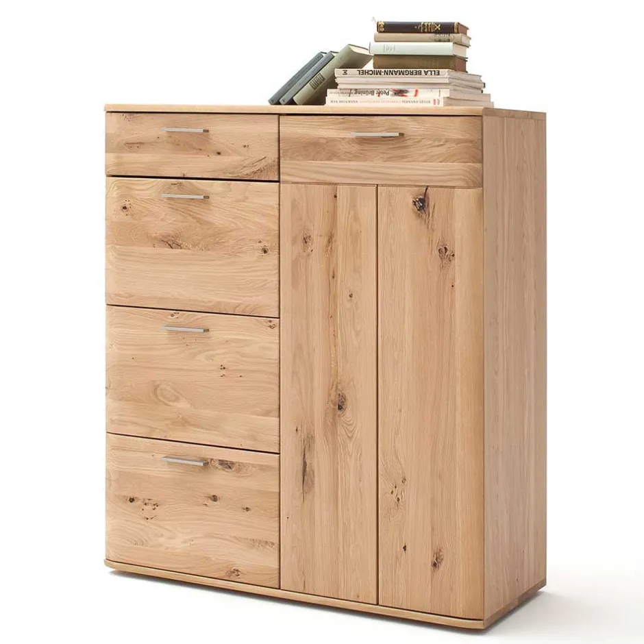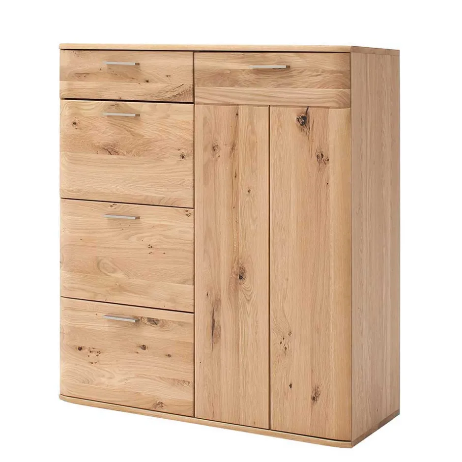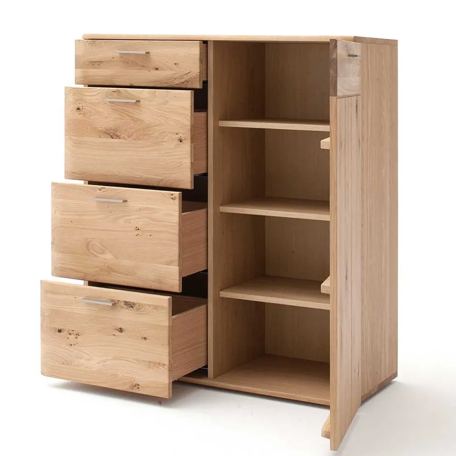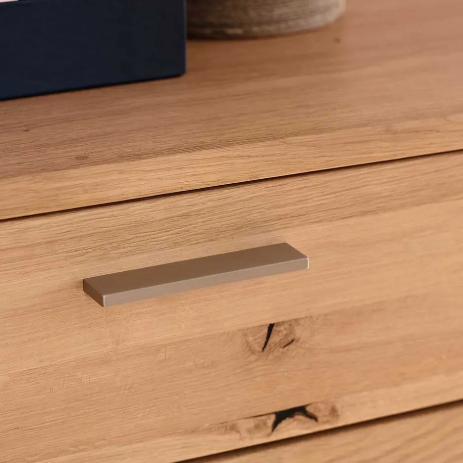 Diese Kommode ist aus massivem Eichenholz für die Front und hochwertiger Spanplatte für den Korpus gefertigt. Die Balkeneiche der Front ist in einem hellen Ölton gehalten, während der Korpus außen mit Eiche Echtholzfurnier in hellem Ölton und innen mit einem folierten Holzdekor in Eiche Bianco veredelt ist. Die Kombination dieser Materialien verleiht der Kommode nicht nur eine ansprechende Optik, sondern auch eine erstklassige Qualität.