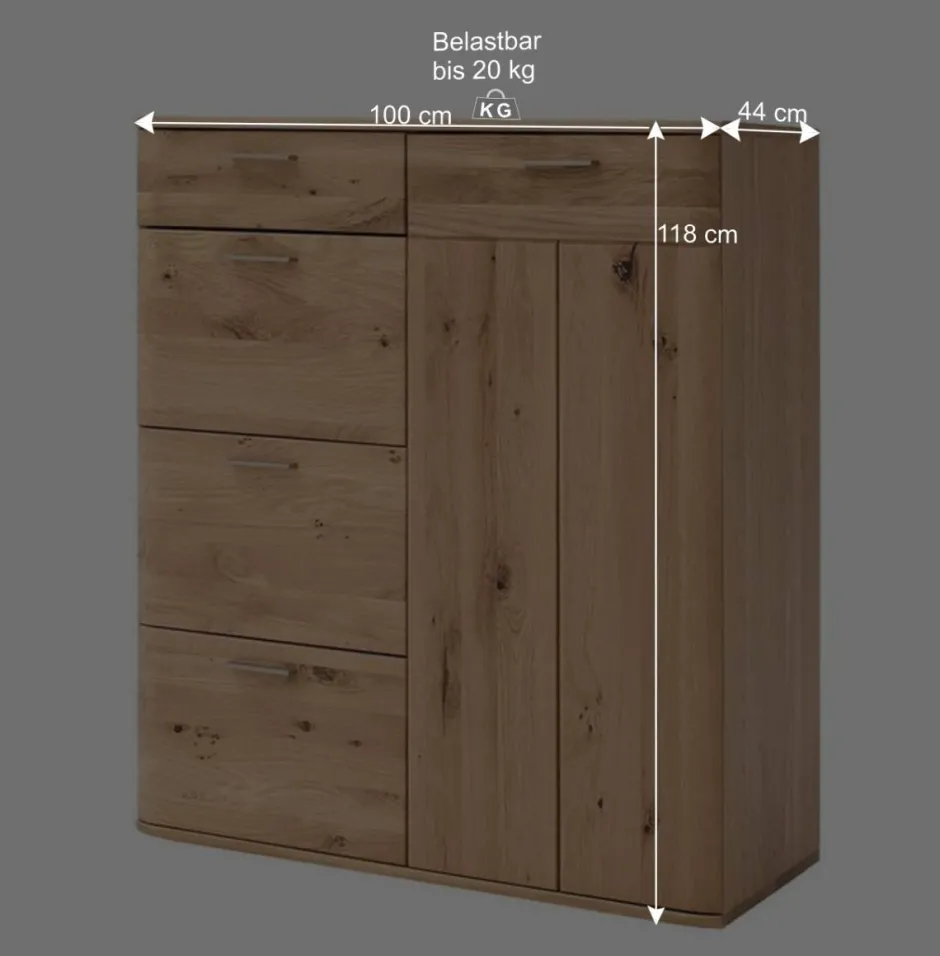 - Aus Eiche Massivholz (Front) und Spanplatte (Korpus) hergestellt