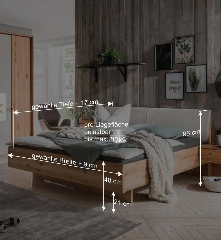 Das Bett „Krofun“ überzeugt durch seine stabile Konstruktion und hervorragende Materialqualität. Mit einer komfortablen Einstiegshöhe von 48 cm wird Ihnen das Ein- und Aussteigen erleichtert, was besonders im Alltag einen großen Komfortgewinn darstellt. Die Liegefläche ist in verschiedenen Größen von 180×190 cm bis 200×220 cm wählbar, sodass Sie genau die passende Größe für Ihr Schlafzimmer finden. Das Bett ist mit einem Mittelsteg samt Stützfuß ausgestattet, der die Auflage von zwei Lattenrosten ermöglicht und für zusätzliche Stabilität sorgt. Pro Liegefläche ist das Bett bis maximal 110 kg belastbar, was eine hohe Tragkraft und Sicherheit gewährleistet.