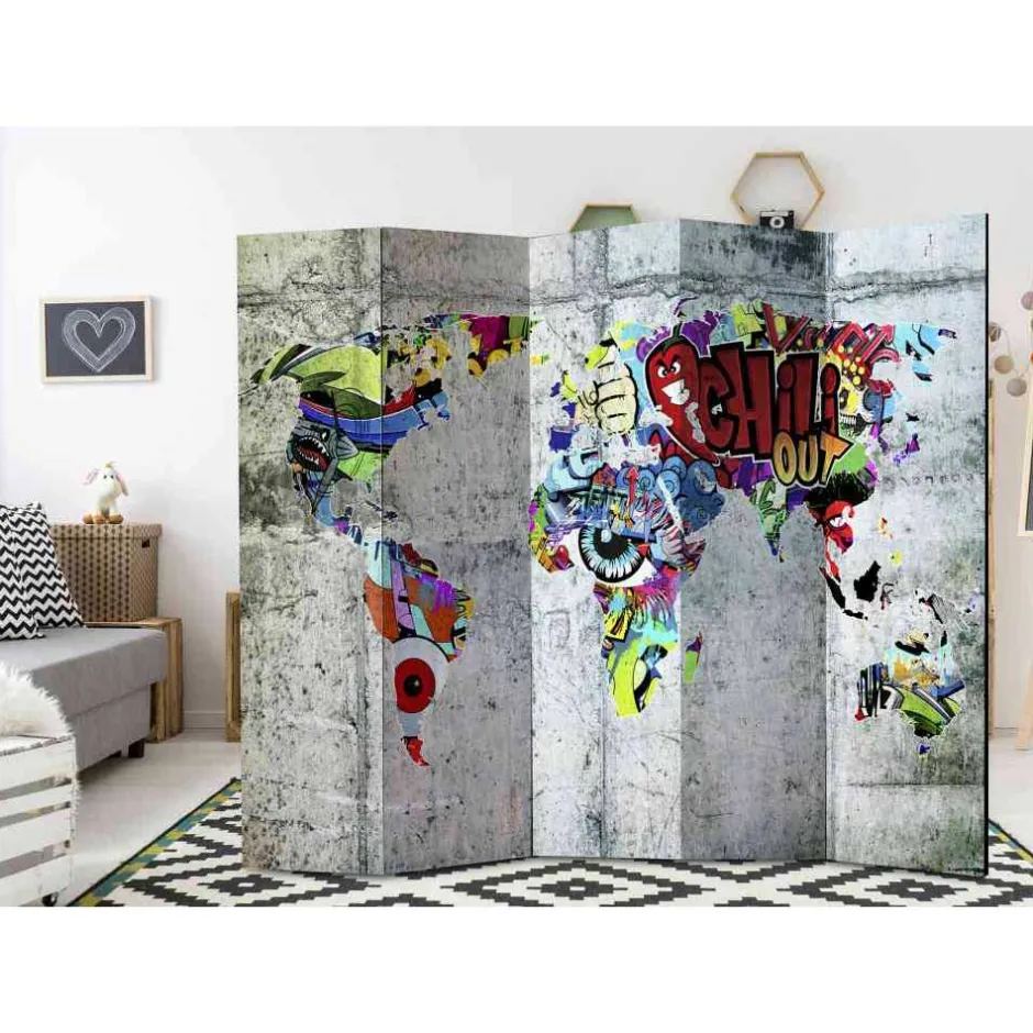 - Kunstvolles Graffiti-Motiv in Weltkartenform auf Betonoptik Hintergrund