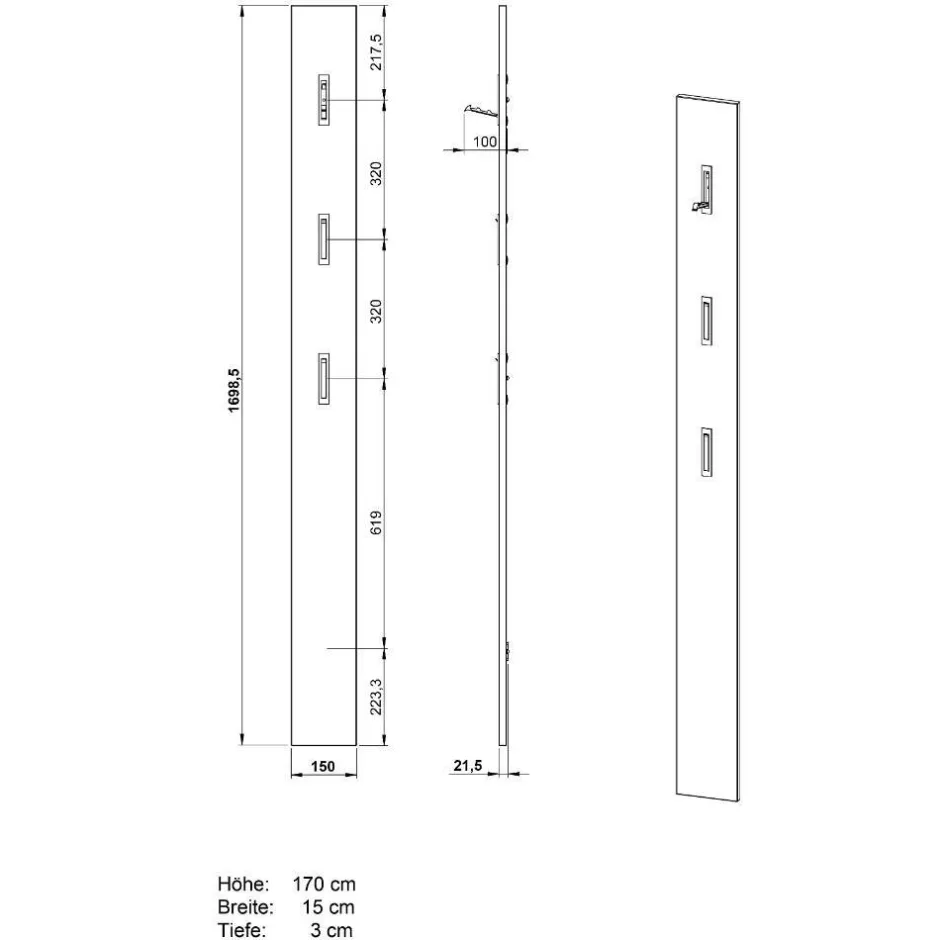 Das Garderobenpaneel mit drei klappbaren Metall-Kleiderhaken ist eine platzsparende Möglichkeit zur Aufbewahrung von Jacken und Accessoires. Die Maße von 15 cm x 169,85 cm x 2,15 cm machen es besonders kompakt. Bereits montiert geliefert, kann es direkt genutzt werden.