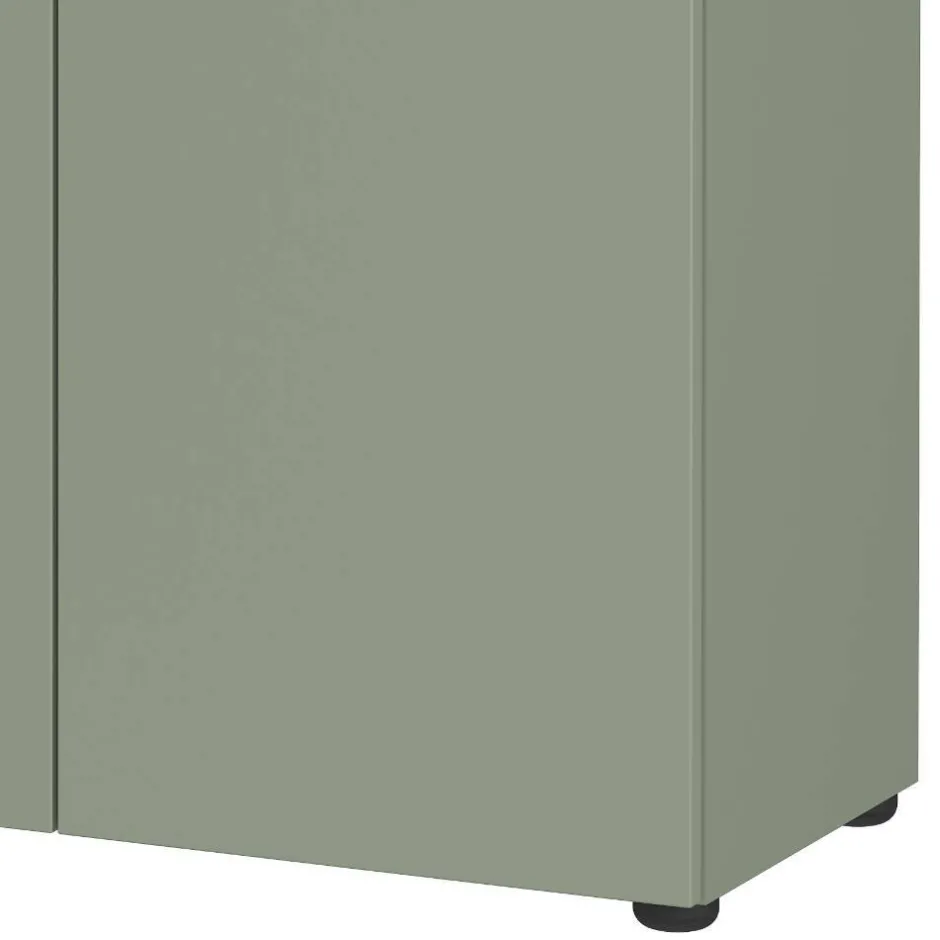 - Der Schrank steht auf schwarzen Kunststoffgleitern