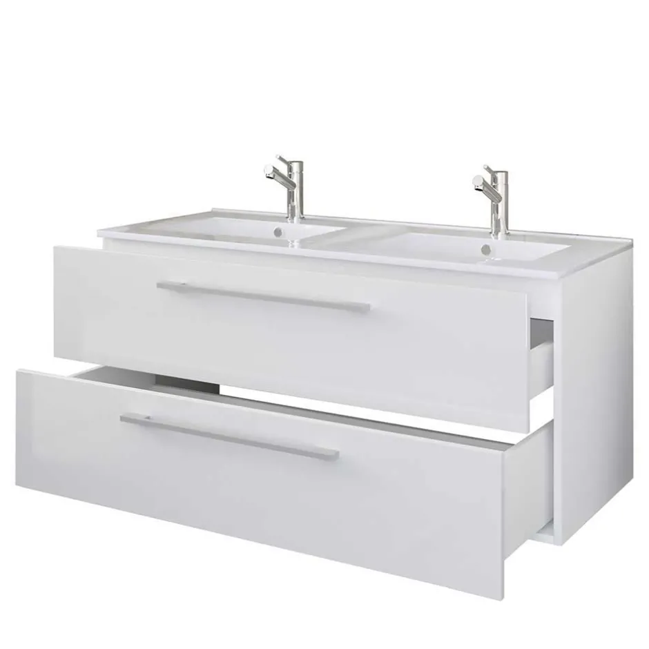 - Mit Doppelwaschbecken aus Keramik, Maße: BxHxT: 110x17x46 cm, Innenmaße: BxT: je ca. 43×28,4 cm