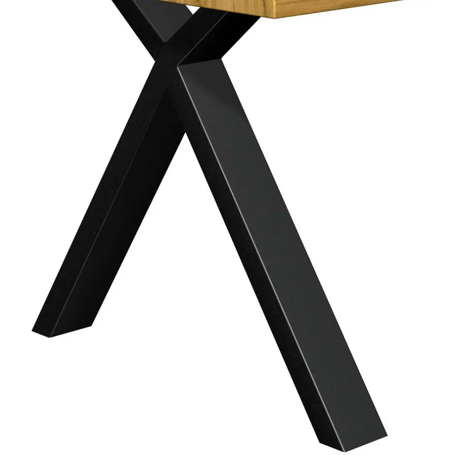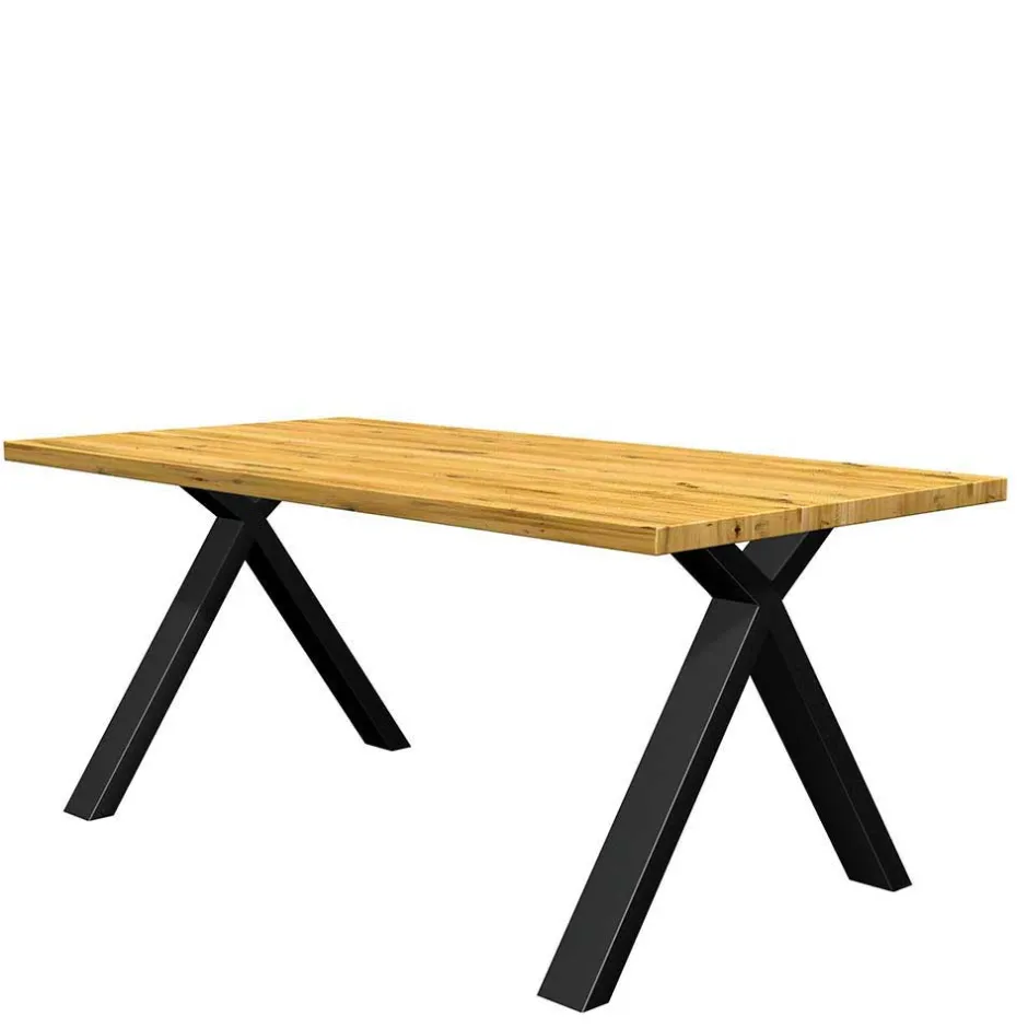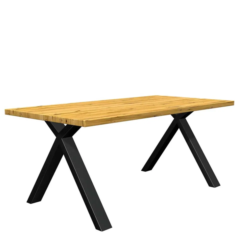 Die Tischplatte des Modells Udot besteht aus massivem Eichenholz mit einer Stärke von etwa 4 cm. Zum Schutz und zur Betonung der lebhaften Maserung sind die Holzoberflächen im Naturton geölt. Sicher getragen wird die solide Platte des Esszimmertisches Udot durch zwei Metall-Fußelemente in extravagantem X-Design. Diese sind in Schwarz pulverbeschichtet und bilden so einen ansprechenden Kontrast zum natürlichen Eichenton der Platte.