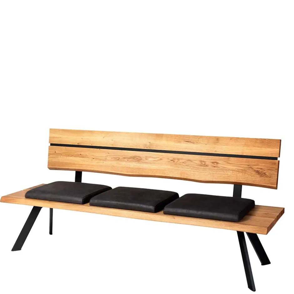 Gefertigt aus massivem Wildeichenholz, strahlt die Bank „Piton“ eine natürliche Wärme und Beständigkeit aus. Die geölte Oberfläche des Holzes betont die einzigartige Maserung und schützt gleichzeitig vor alltäglichen Beanspruchungen. Für zusätzlichen Sitzkomfort sorgen die drei verschiebbaren Sitzpolster, die mit hochwertigem schwarzem Echtleder bezogen sind. Unter den Polstern befindet sich eine komfortable Schaumstoffpolsterung, die für angenehmen Sitzkomfort sorgt. Die pulverbeschichteten Metallbeine in schräger Konstruktion gewährleisten eine stabile und sichere Standfestigkeit, selbst bei intensiver Nutzung. Ein weiteres Highlight ist die leicht geneigte Rückenlehne aus Massivholz, die mit einem schwarzen Hochdrucklaminat-Einsatz veredelt wurde – so ist nicht nur die Optik, sondern auch die Anlehnung optimal.