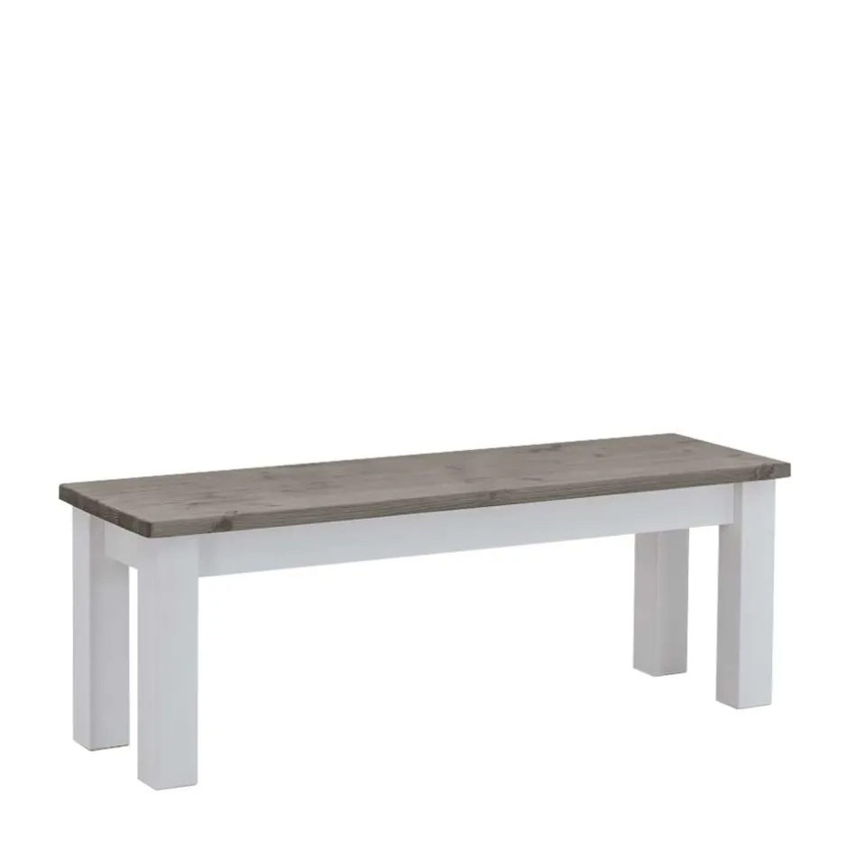 Hergestellt aus massiver nordischer Kiefer, strahlt unsere Sitzbank natürliche Schönheit und Robustheit aus. Die Wahl von Kiefernholz als Hauptmaterial bringt zahlreiche Vorteile mit sich. Das Holz ist nicht nur äußerst stabil und langlebig, sondern auch leicht zu pflegen. Durch die weiße Lackierung der Oberflächen und die grau lackierte Sitzfläche entsteht eine zweifarbige Optik, die Ihrem Wohnraum eine besondere Note verleiht. Die durchscheinende Maserung des Kiefernholzes bleibt dabei dezent sichtbar und verleiht der Bank einen einzigartigen Charme.