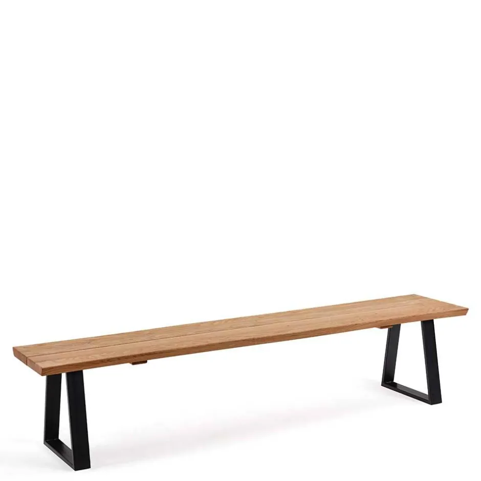 Das markante, trapezförmige Bügelgestell aus schwarz pulverbeschichtetem Metall sorgt für eine hohe Belastbarkeit von 300 kg und eine standfeste Konstruktion. Durch die gute Materialqualität und die originelle Optik ist die Sitzbank „Sympatia“ ein echter Hingucker in jedem Raum.