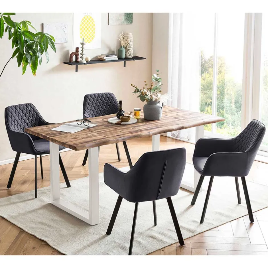 Ein stabiler Unterbau aus einem weiß lackierten Metall-Bügelgestell sorgt für die notwendige Standfestigkeit und rundet die Mischung aus natürlichem Werkstoff und industriellem Flair perfekt ab. Zwei Breiten stehen zur Auswahl: Mit 160 cm oder 180 cm kann der Tisch exakt auf den zur Verfügung stehenden Raum und die gewünschte Anzahl an Sitzplätzen abgestimmt werden – ganz gleich, ob für das gemütliche Frühstück zu zweit oder das ausgedehnte Dinner mit Freunden.