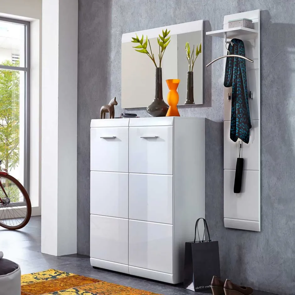 - Spiegel und Paneel zur Wandmontage, Schuhschrank steht auf schwarzen Möbelgleitern