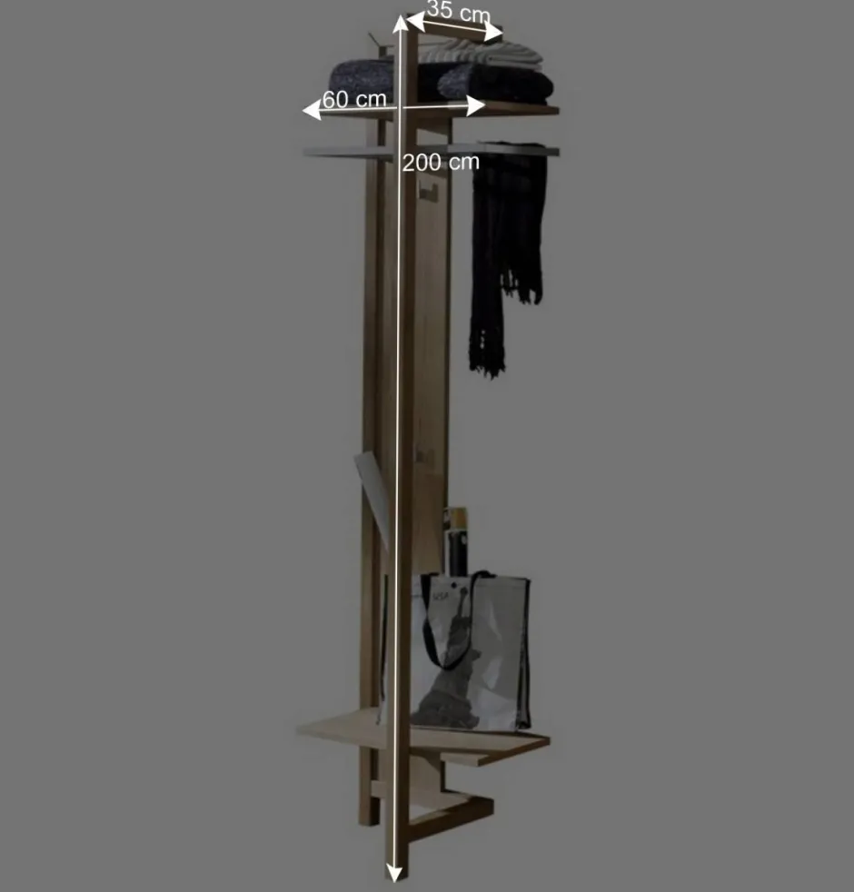 Mit einer Breite von 60 cm, einer Höhe von 200 cm und einer Tiefe von 35 cm ist dieses Paneel optimal für kleine bis mittelgroße Eingangsbereiche geeignet. Der intelligente Aufbau maximiert den Stauraum, ohne dabei viel Platz einzunehmen. Die solide Hutablage aus Holz wird ergänzt durch eine stabile Metall-Kleiderstange mit Mittelsteg und zwei festen Metall-Kleiderhaken. Zusätzlich bietet die untere Ablagefläche Platz für Schuhe oder Handtaschen.