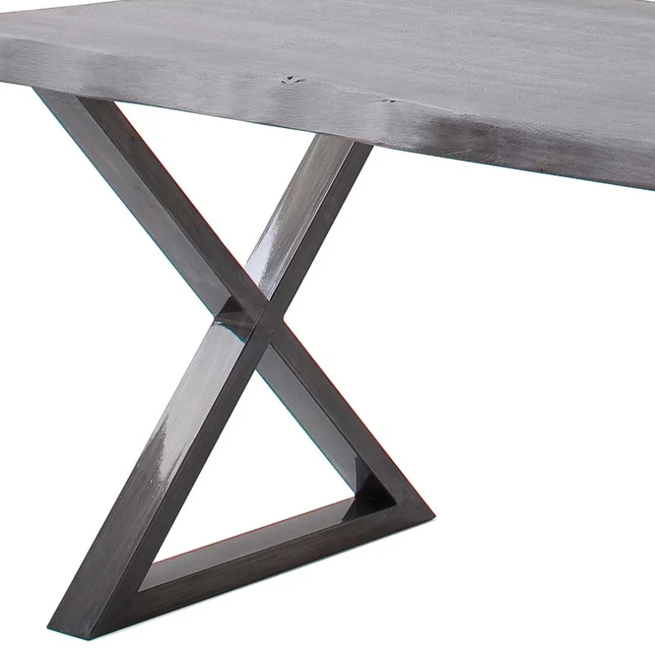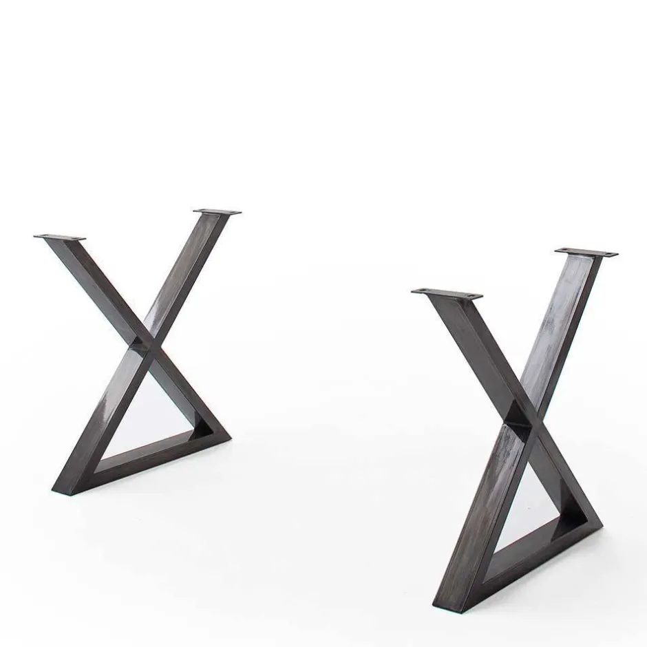 Das Designgestell aus Metall besteht aus zwei X-Beinen, die in Altsilber (Antik-Optik gewischt) gehalten sind. Diese Konstruktion bietet nicht nur eine breite und stabile Auflagefläche, sondern setzt auch einen markanten, industriellen Akzent. Bei den Varianten 002 und 003 sind die Beine versetzbar montierbar, was zusätzliche Flexibilität in der Gestaltung ermöglicht.