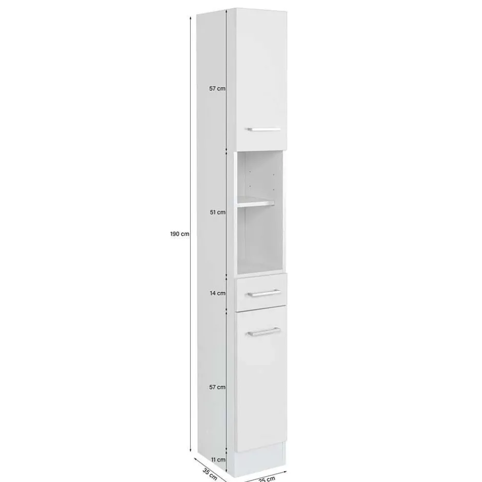 Enorme Stauraummöglichkeiten machen diesen Hochschrank zum unverzichtbaren Helfer in Ihrem Badezimmer. Mit einer Breite von nur 25 cm, einer Höhe von 190 cm und einer Tiefe von 35 cm passt „Loenixa“ auch in schmale Nischen, ohne dabei an Stauraum zu sparen. Ein offenes Fach bietet Platz für dekorative Elemente oder häufig benötigte Utensilien, die jederzeit griffbereit sein sollen. Hinter den zwei Drehtüren, die sich dank beidseitig montierbarem Türanschlag flexibel an die Gegebenheiten Ihres Badezimmers anpassen, verbergen sich je ein Einlegeboden. So können Sie die Innenaufteilung ganz nach Ihren Bedürfnissen gestalten. Die Türen sind mit stabilen Metallbeschlägen versehen, die für gleichmäßigen Halt und eine lange Lebensdauer sorgen. Mittig integriert, befindet sich eine großzügige Schublade mit Metallauszug, die sich leicht und leise öffnen lässt – selbst bei voller Beladung. Großzügige Bügelgriffe ermöglichen ein bequemes Öffnen, auch wenn die Hände feucht oder eingecremt sind. Dieses durchdachte Konzept bietet nicht nur Ordnung, sondern auch Komfort im täglichen Gebrauch.