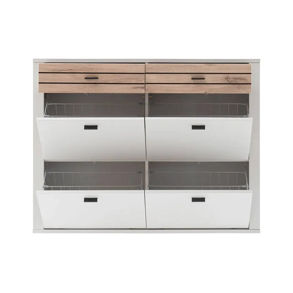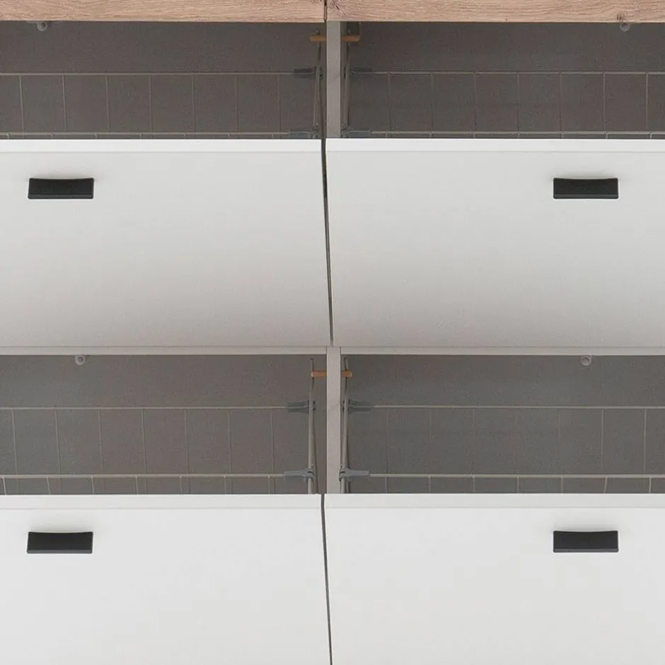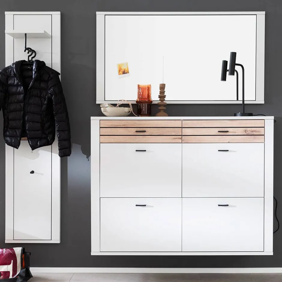 Dank der hängenden Konstruktion lässt sich das Set besonders effizient in kleineren oder schmalen Fluren einsetzen, ohne wertvollen Platz zu beanspruchen. Die Kombination bietet Stauraum für Schuhe, Jacken und Accessoires, während der großzügige Spiegel den Raum optisch erweitert.