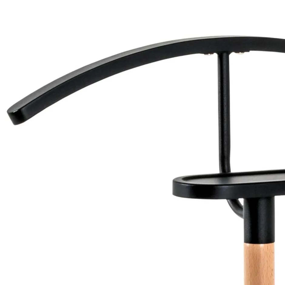 Exas vereint schlichtes Design mit raffinierter Funktionalität und wird so zum stilvollen Begleiter in Ihrem Schlaf- oder Ankleidezimmer. Der reizvolle Materialmix aus robustem, pulverbeschichtetem Stahl und edlem, massivem Buchenholz verleiht diesem Herrendiener eine besondere Eleganz. Die klare Linienführung und der modisch reduzierte Look fügen sich nahtlos in moderne wie klassische Wohnstile ein.
