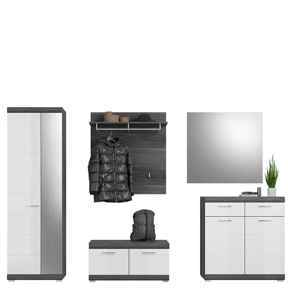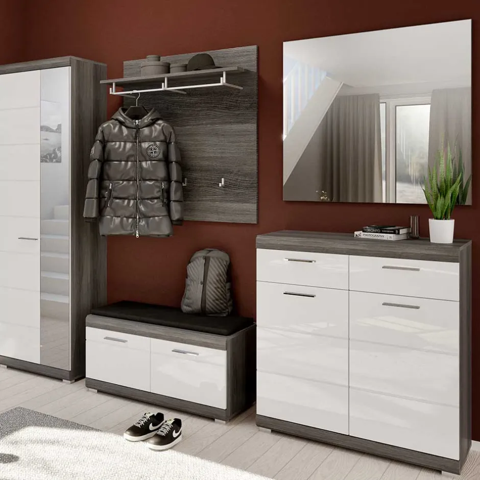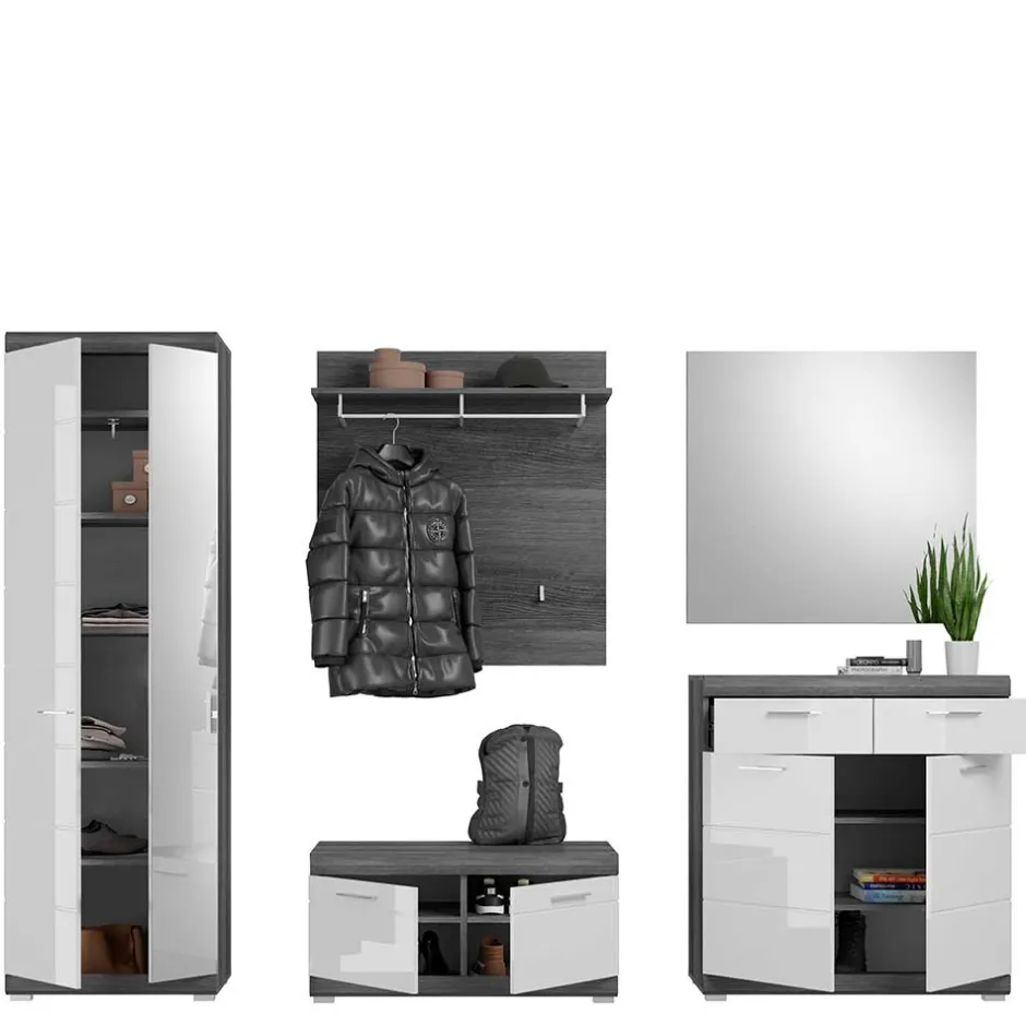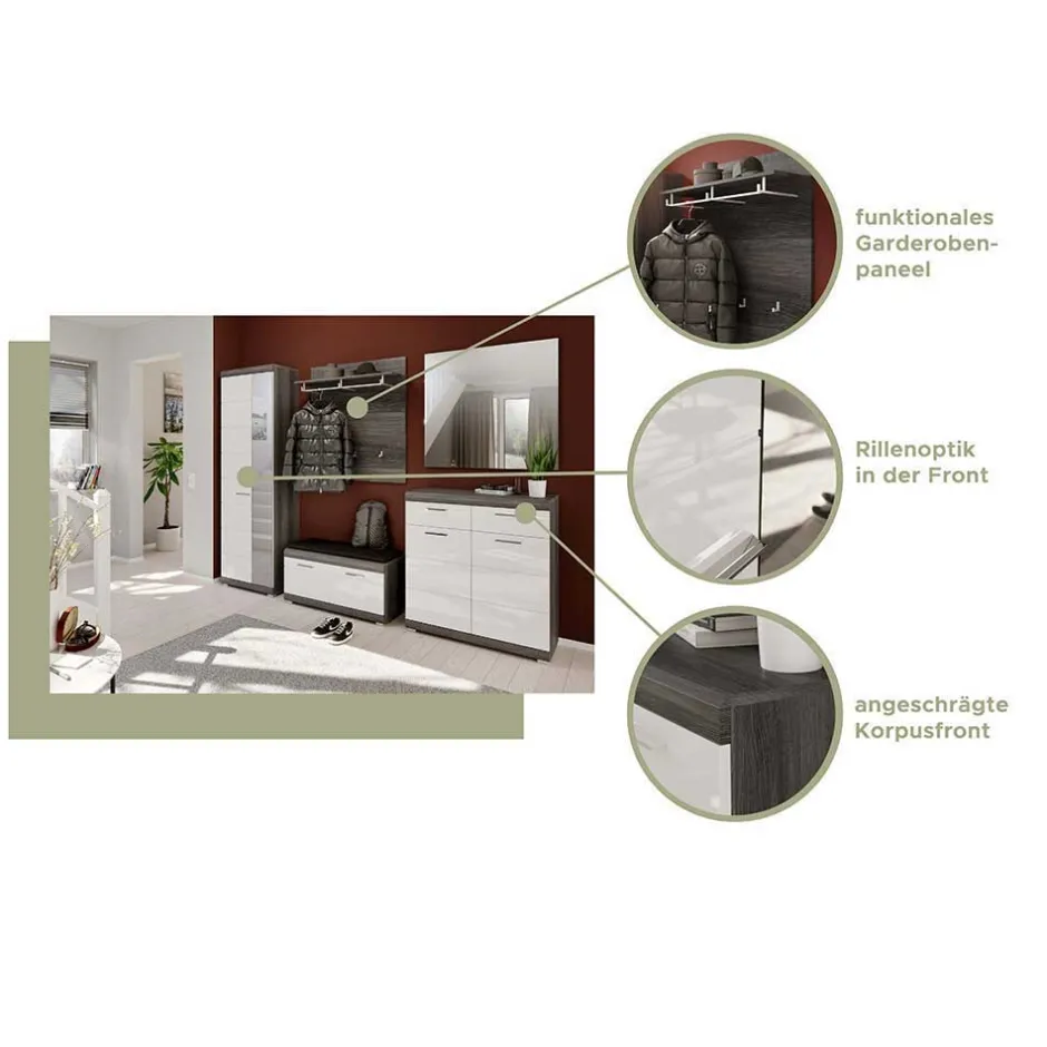Mit dem fünfteiligem Flurmöbel-Set „Nancys“ zieht ein Hauch urbaner Eleganz in den Eingangsbereich ein. Das moderne Design besticht durch klare Linien, kontrastreiche Farben und eine funktionale Formensprache – typisch für den zeitgenössischen Wohnstil, der Ordnung, Stil und Zweckmäßigkeit harmonisch vereint. In der Kombination aus strahlendem Weiß Hochglanz und rauchgrauer Holzoptik entsteht ein attraktives Spiel aus Licht und Tiefe, das Ihren Flur nicht nur aufwertet, sondern regelrecht verwandelt.