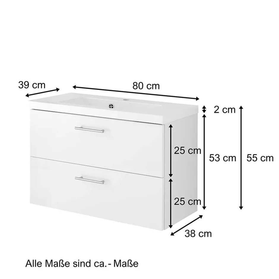Mit einer Höhe von 54 cm, einer Tiefe von 39 cm und wahlweise 60 oder 80 cm Breite passt sich der Waschtisch flexibel an verschiedenste Raumgrößen an – perfekt auch für kleinere Bäder. Zwei großzügige Schubladen mit robustem Metallauszug bieten ausreichend Platz für Pflegeprodukte, Handtücher und Alltagshelfer. Der obere Auszug ist dabei mit einem Siphonausschnitt versehen, sodass kein Stauraum verloren geht.