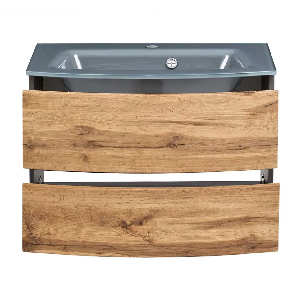 Mit einer Breite von 80 cm, einer Höhe von 53 cm und einer Tiefe von 49 cm bietet der Waschtisch großzügigen Stauraum bei gleichzeitig kompakter Form – ideal für moderne Badezimmer. Zwei geräumige Schubladen mit hochwertigen Metall-Vollauszügen und Soft-Close-Funktion gleiten sanft und leise. Dank der dezenten, grifflosen Fronten bleibt das klare Erscheinungsbild des Waschtischs erhalten. Die gebogenen Fronten verleihen dem Möbel eine elegante Dynamik, die sofort ins Auge fällt.