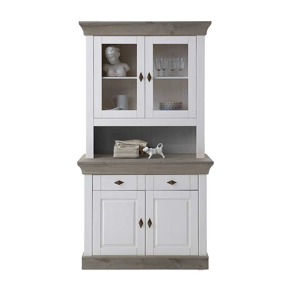 Die lackierten Oberflächen in Weiß, kombiniert mit einem grau lackierten Sockel, der Zwischenplatte und der Kranzleiste, verleihen dem Buffetschrank „Mirandesca“ seine zauberhafte zweifarbige Optik. Die durchscheinende Maserung des Holzes bleibt dabei erhalten und verleiht dem Möbelstück eine charmante Natürlichkeit. Dank der Lackierung ist die Oberfläche zudem leicht zu reinigen und besonders strapazierfähig.