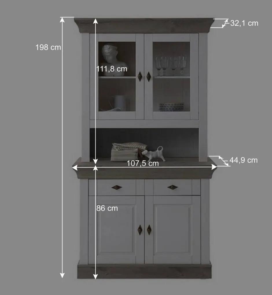 Mit einer Breite von 108 cm, einer Höhe von 197,8 cm und einer Tiefe von 45 cm bietet der Buffetschrank „Mirandesca“ ausreichend Stauraum und passt perfekt in Ihr Zuhause. Die aufwendig gefräste Zwischenplatte und die Kranzleiste verleihen ihm eine besonders hochwertige Ausstrahlung.