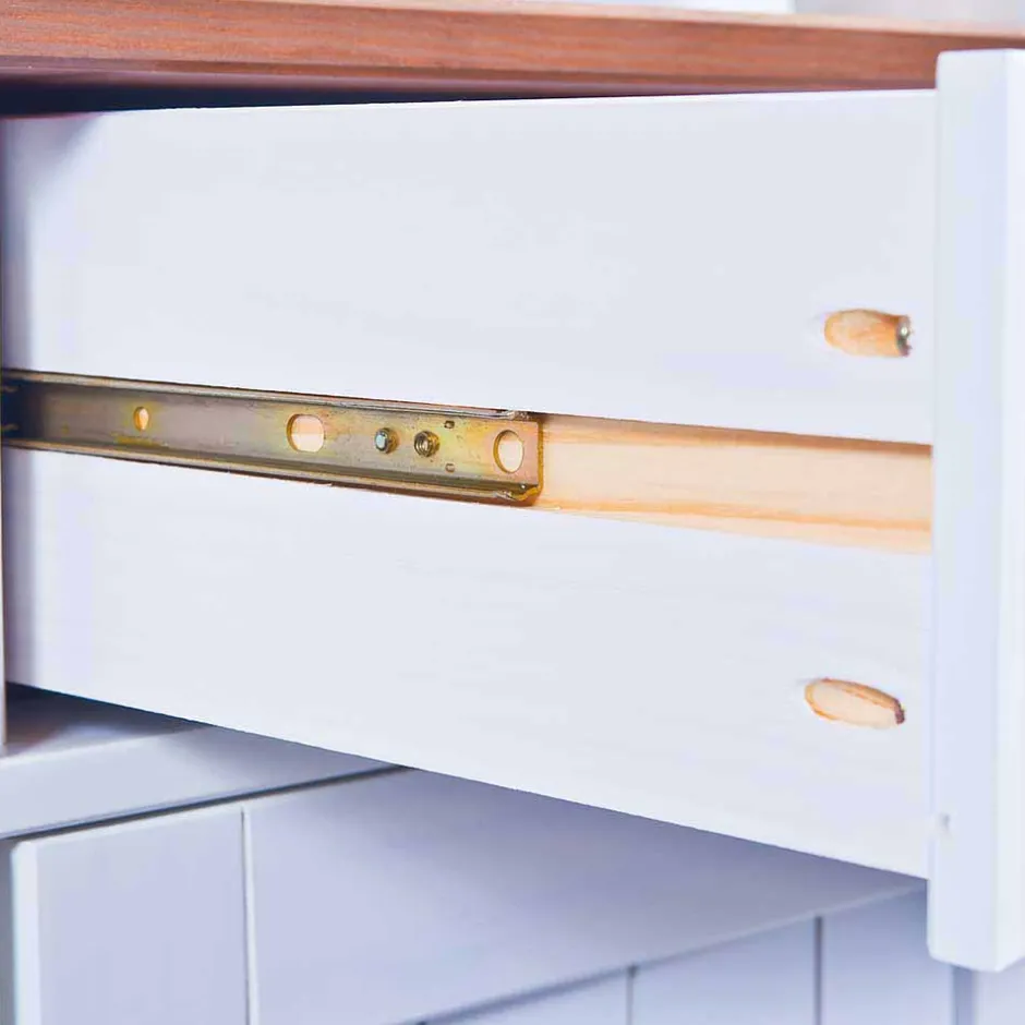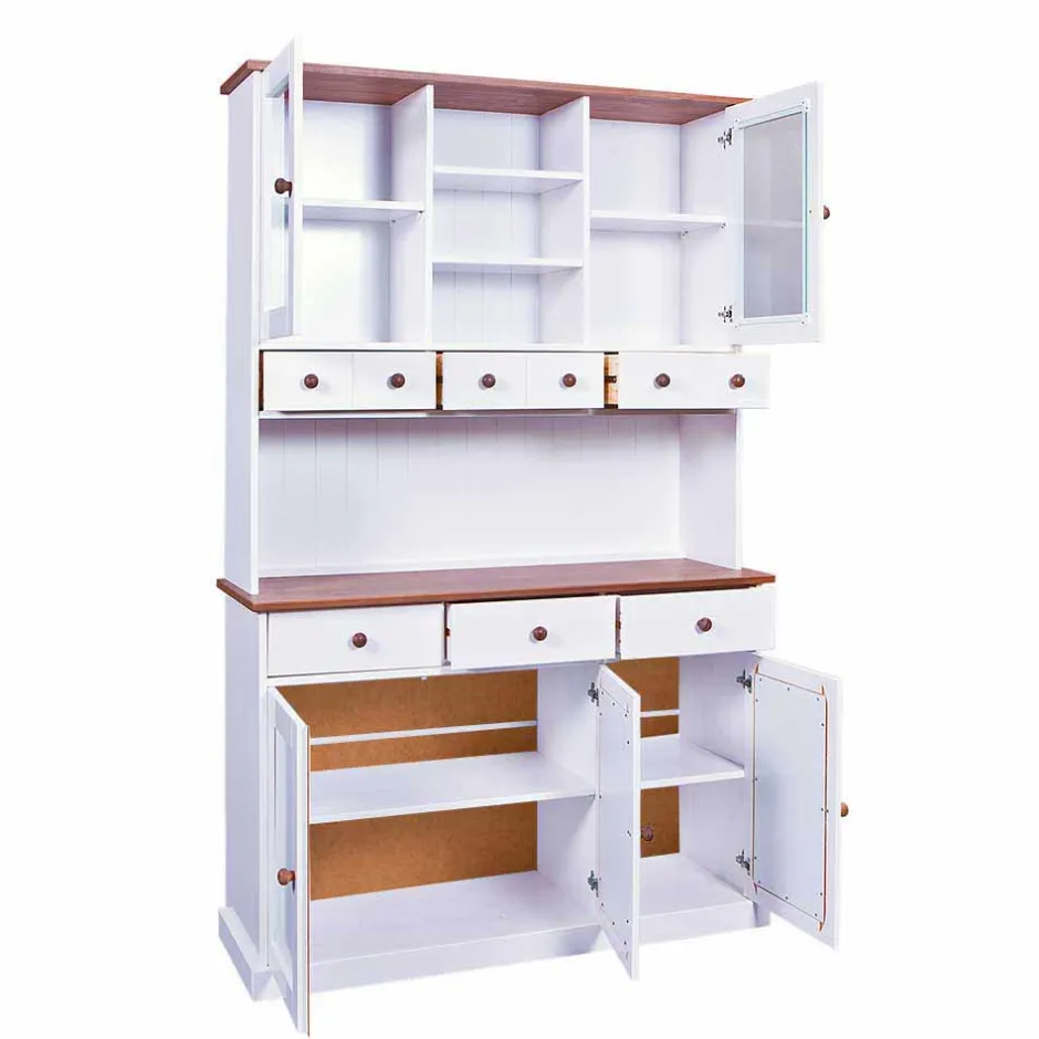 Hinter den Türen verbirgt sich ein durchdachtes Innenleben: Jede Sektion ist mit einem Einlegeboden ausgestattet, der Ihnen hilft, Ordnung zu halten und Ihre Gegenstände übersichtlich zu verstauen. Im Aufsatz befinden sich zudem drei kleine offene Fächer und ein großes Mittelfach, ideal zur Präsentation von Büchern, Fotos oder Erinnerungsstücken. Die Rückwand in Paneeloptik verleiht diesen Fächern zusätzliche Eleganz und Tiefe. Ergänzt wird die Funktionalität durch sechs Schubladen mit robustem Metallauszug, die weiteren Stauraum für kleinere Gegenstände bieten. Die runden Knopfgriffe aus Holz runden das harmonische Gesamtbild ab.