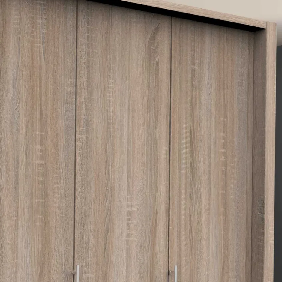 Eine Besonderheit von „Zayun“ ist das Türdesign. Die rechte Seite ist mit einer klassischen Drehtür versehen, während die linke Seite mit einer Panorama-Falttür ausgestattet ist. Diese innovative Tür öffnet sich platzsparend nach vorn, was Ihnen einen bequemen Zugang zu Ihren Habseligkeiten ermöglicht. Abgerundet wird das Design durch schlichte Stangengriffe aus Metall, die nicht nur das Gesamtbild auflockern, sondern auch die Bedienung erleichtern.