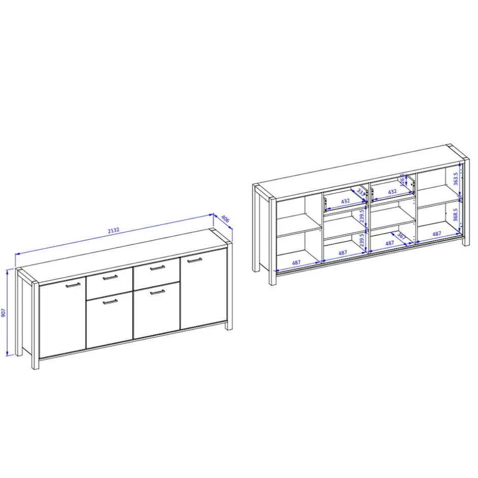 Mit Maßen von 213 cm Breite, 91 cm Höhe und 41 cm Tiefe bietet das Sideboard „Zavorra“ viel Stauraum. Die vier Türen mit soliden Metallbeschlägen versprechen Langlebigkeit und ein sanftes Öffnen. Hinter jeder Tür verbirgt sich ein praktischer Einlegeboden.