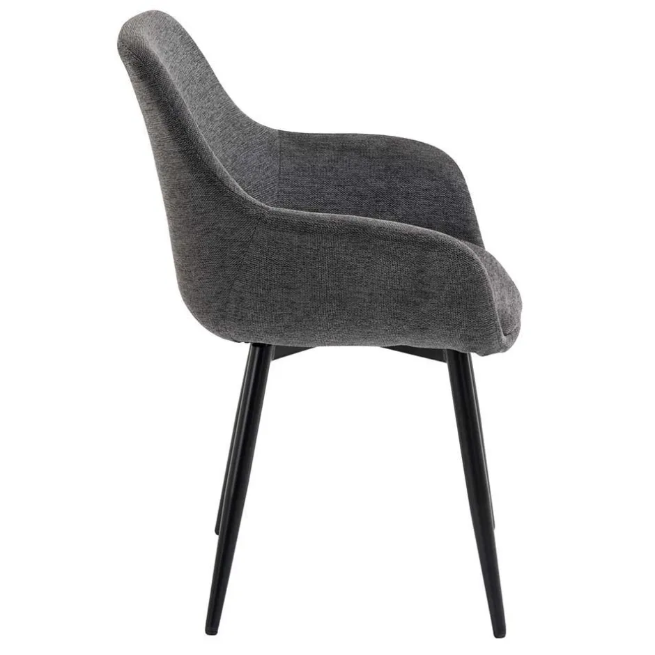 Die vier Armlehnenstühle überzeugen mit einem strapazierfähigen Strukturwebstoff in Anthrazit. Die Polsterung aus hochwertigem Schaumstoff bietet angenehmen Sitzkomfort, während die stabilen, schwarz pulverbeschichteten Metallbeine mit ihrer konisch zulaufenden Form für ein harmonisches Gesamtbild sorgen.