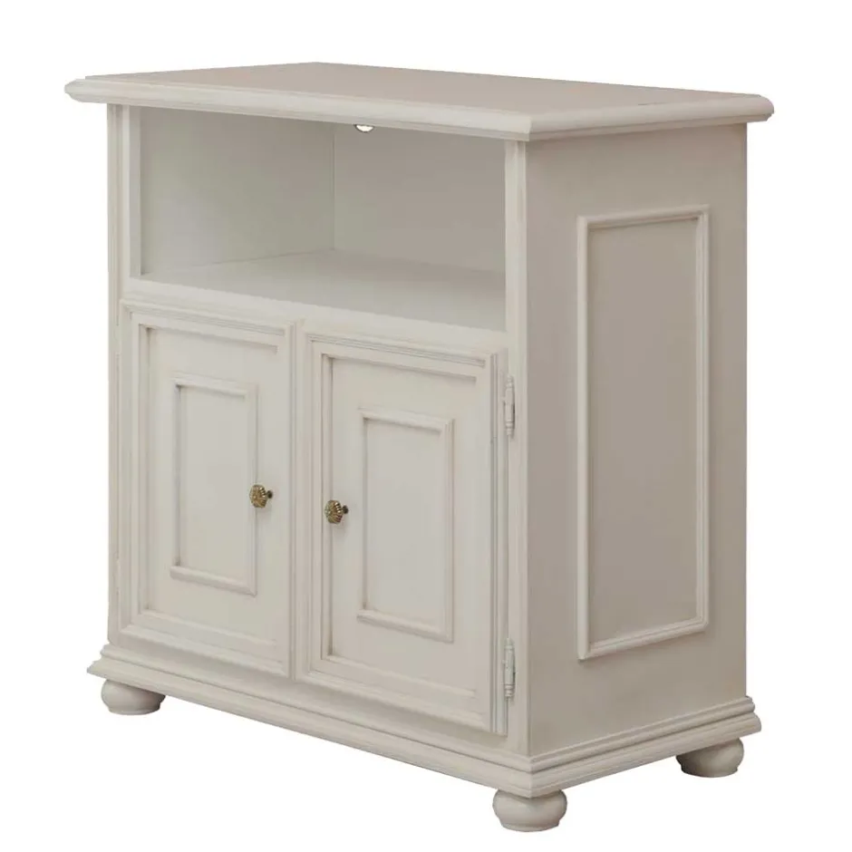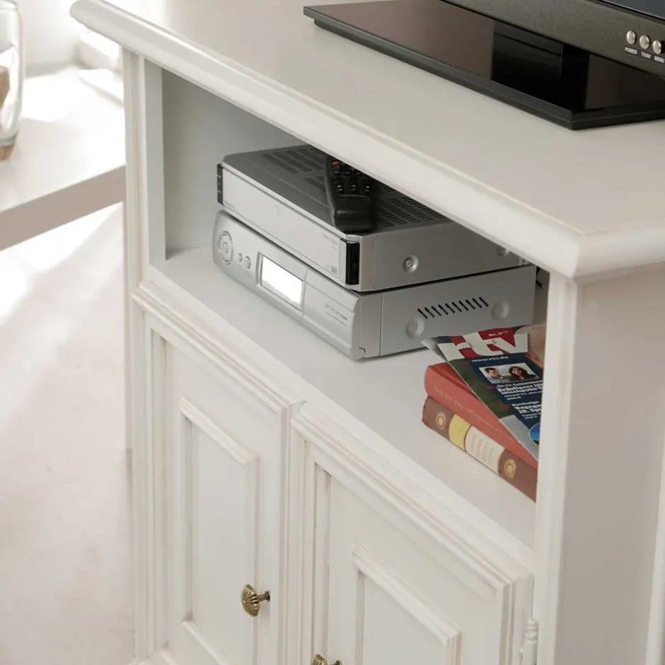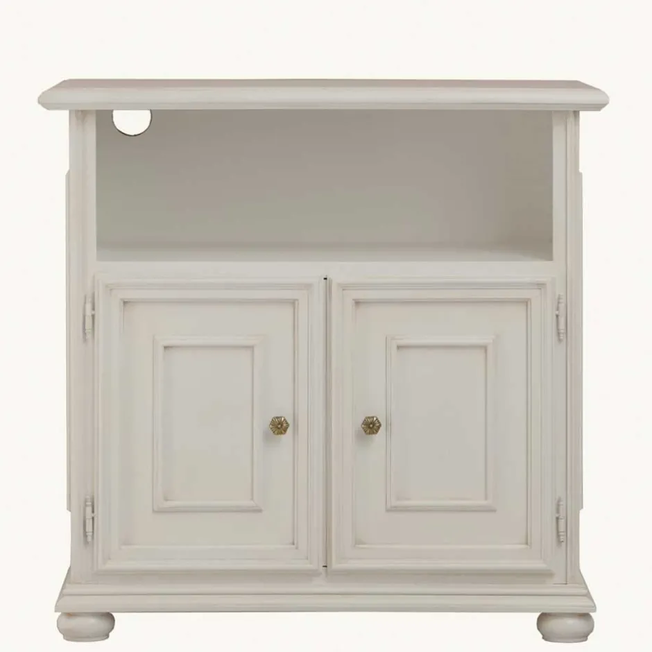 Die Kommode bietet ein großes, offenes Gerätefach, ideal für Ihre Unterhaltungselektronik. Ein praktisches Loch zur Kabelführung in der Rückwand sorgt dafür, dass alle Kabel ordentlich und diskret verlegt werden können. Hinter den beiden Türen, die mit hochwertigen Metallbeschlägen ausgestattet sind, befindet sich zusätzlicher Stauraum. Die Türen sind aufwändig in Kassettenoptik gestaltet und mit hübschen Zierfräsungen versehen, die dem Möbelstück eine raffinierte und edle Note verleihen.