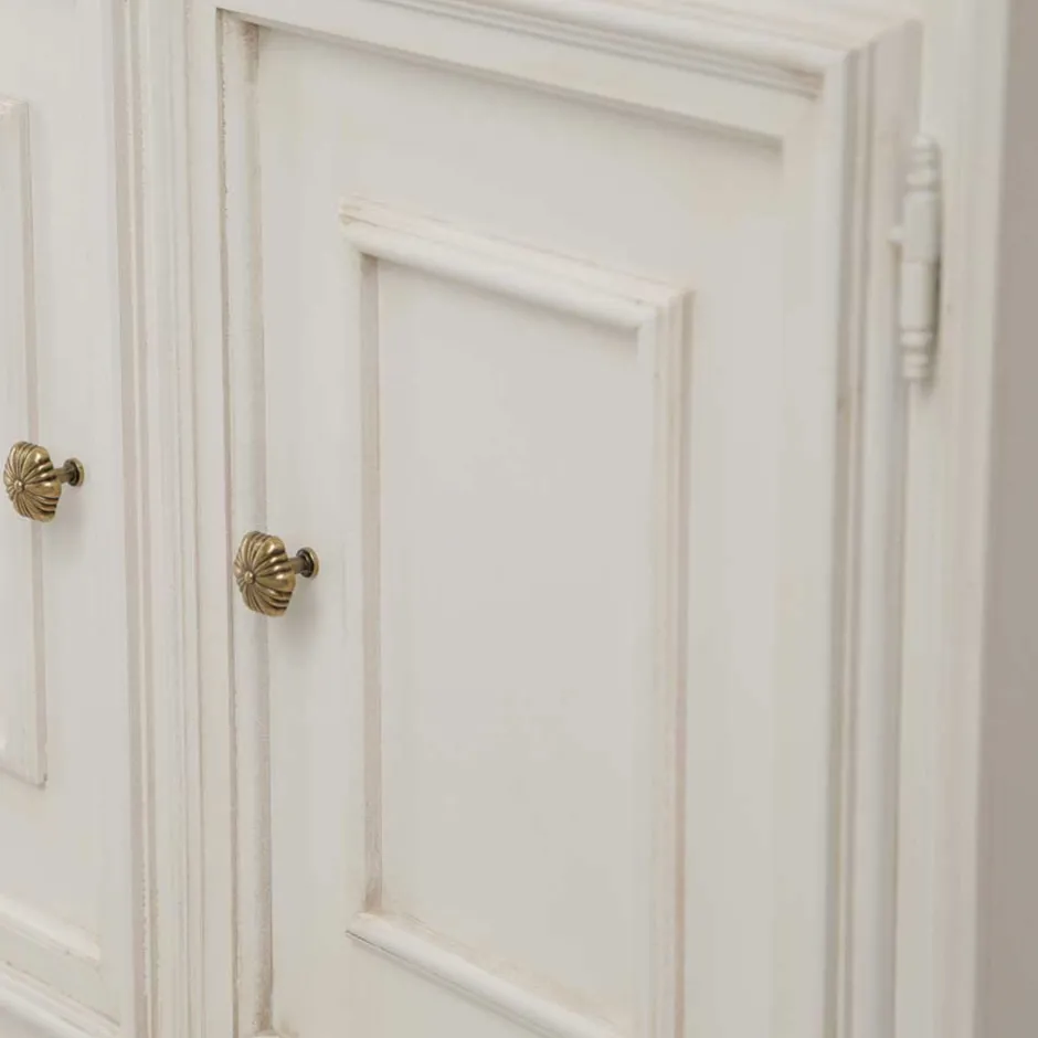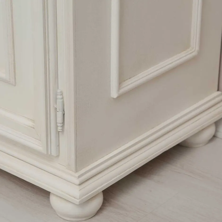 Die Holzoberflächen sind mit Tanganjika Holz echtholzfurniert und im weißen Antiklook lackiert. Echtholzfurnierung ist ein Verfahren, bei dem dünne Schichten aus echtem Holz auf die Oberflächen der Möbel aufgetragen werden. Dieses Verfahren bewahrt die natürliche Holzmaserung und verleiht jedem Möbelstück eine einzigartige Optik. Die Lackierung im weißen Antiklook fügt eine charmante, leicht gebrauchte Ästhetik hinzu. Durch die handwerkliche Lackierung entstehen kleine Farbeinschlüsse, leichte Unebenheiten und Haarrisse, die jedem Stück eine unverwechselbare Persönlichkeit verleihen.