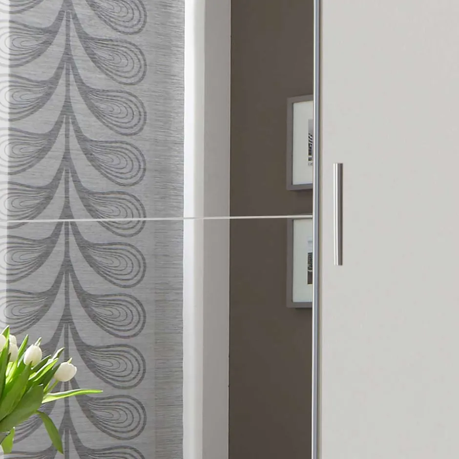 Der Kleiderschrank „Denada“ verfügt über zwei leichtgängige Schwebetüren in der Mitte, die mit großzügigen Ganzkörperspiegeln versehen sind. Diese Spiegel sind nicht nur praktisch für Ihre tägliche Garderobenwahl, sondern lassen den Raum auch größer und heller wirken. Die Außentüren sind Drehtüren mit stabilen Metallbeschlägen, die eine lange Lebensdauer garantieren. Die handlichen Metallgriffleisten in Alufarben an den Schwebetüren und die kurzen Kunststoff-Griffleisten an den Drehtüren unterstreichen den modernen Look und erleichtern das Öffnen und Schließen der Türen.