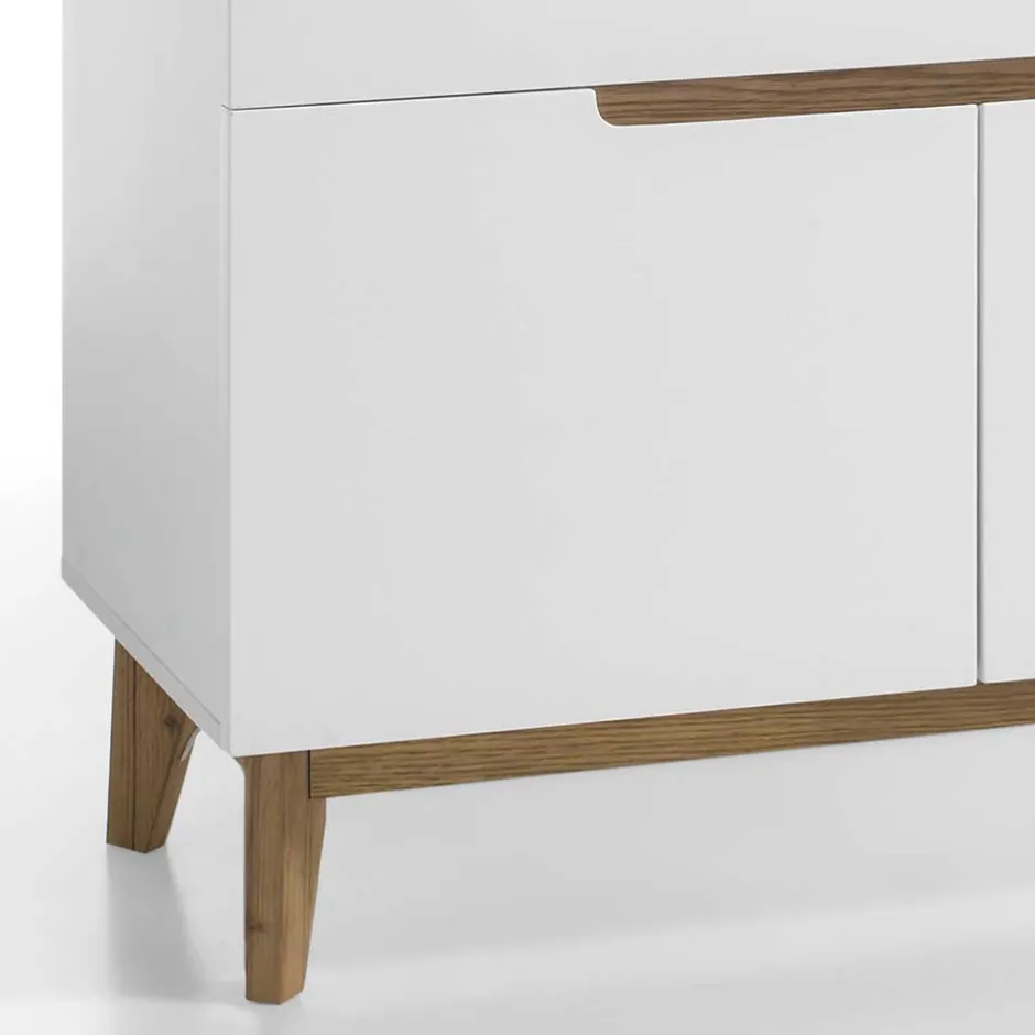 Zwei Türen mit Soft-Close-Funktion sorgen für ein geräuschloses und sanftes Schließen, was den Komfort und die Langlebigkeit des Möbelstücks erhöht. Hinter den Türen befindet sich ein Einlegeboden, der zusätzlichen Stauraum bietet und flexibel genutzt werden kann. Eine breite Schublade mit Metallauszug erstreckt sich über die gesamte Breite des Sekretärs und bietet reichlich Platz für größere Gegenstände. Dank der praktischen Griffmulden lassen sich Klappe, Schublade und Türen mühelos öffnen. Das leicht nach außen gestellte Vierfußgestell gewährleistet einen stabilen Stand und erleichtert die Reinigung sowie die Luftzirkulation unter dem Möbelstück.