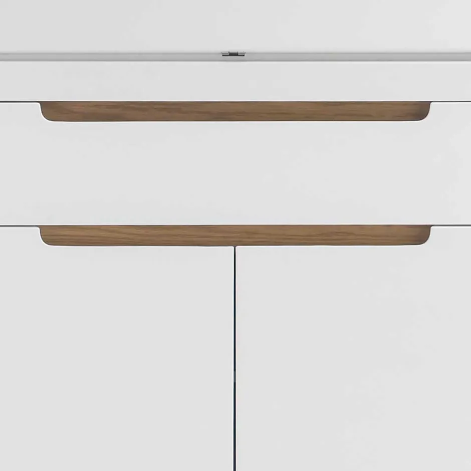 Die Oberfläche des Sekretärs ist in einem eleganten matten Weiß lackiert. Diese Lackierung verleiht dem Möbelstück nicht nur ein edles Aussehen, sondern bietet auch praktische Vorteile. Matt weiße Lackierungen sind weniger anfällig für Fingerabdrücke und Schmutz, wodurch die Reinigung erleichtert wird. Zusätzlich schützt die Lackierung das MDF vor Kratzern und anderen Beschädigungen. Die Absetzungen des Sekretärs sind mit echtem Asteichenholz furniert und natürlich geölt. Furnier ist eine dünne Schicht aus echtem Holz, die auf die Oberfläche aufgebracht wird, um das Aussehen von Massivholz zu erzielen. Diese Methode bietet die natürliche Schönheit von Holz, während sie gleichzeitig kosteneffizient und ressourcenschonend ist. Die natürliche Ölung des Holzes hebt dessen einzigartige Maserung hervor und schützt es vor Feuchtigkeit und Schmutz.
