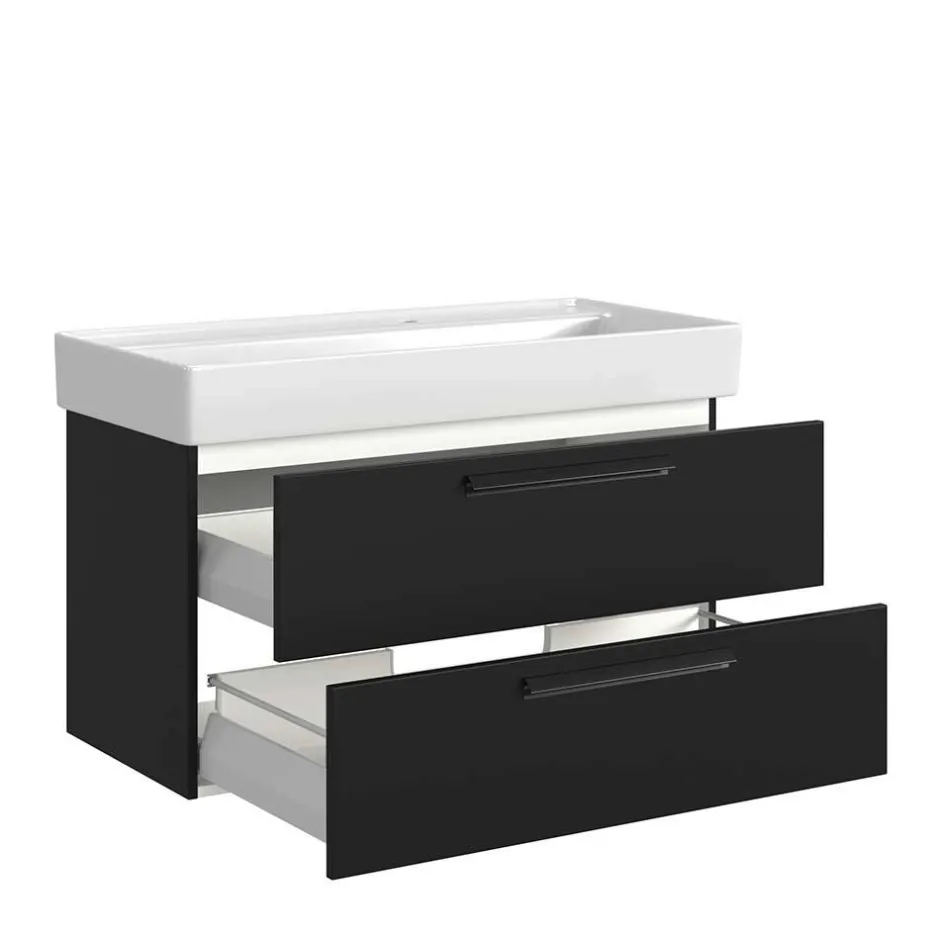 Hinter der stilvollen Fassade steckt eine durchdachte Stauraumlösung: Zwei großzügige Schubladen mit langlebigen Metallauszügen bieten ausreichend Platz für Pflegeprodukte und Badutensilien. Dank der Soft-Close-Technologie schließen sie besonders leise und sanft. Die obere Schublade ist mit einem praktischen Siphonausschnitt versehen, sodass der Stauraum optimal genutzt werden kann. Die schmalen, schwarzen Metallgriffe in Leistenform unterstreichen das minimalistische Design.