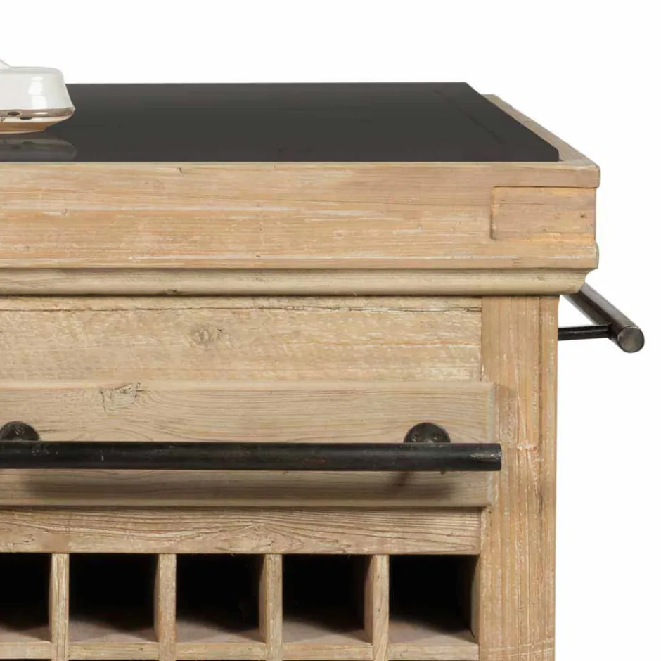 Akzentuiert mit einem Kühlschrankgriff sowie Beschlägen und einem Handtuchhalter aus schwarzem Metall, setzt der Tisch stilvolle und praktische Highlights. Diese Details tragen nicht nur zur Funktionalität bei, sondern verleihen dem Möbelstück auch einen modernen Touch. Die dekorative Weinaufbewahrung bietet eine elegante Möglichkeit, Ihre Lieblingsweine stilvoll zu präsentieren und gleichzeitig immer griffbereit zu haben.